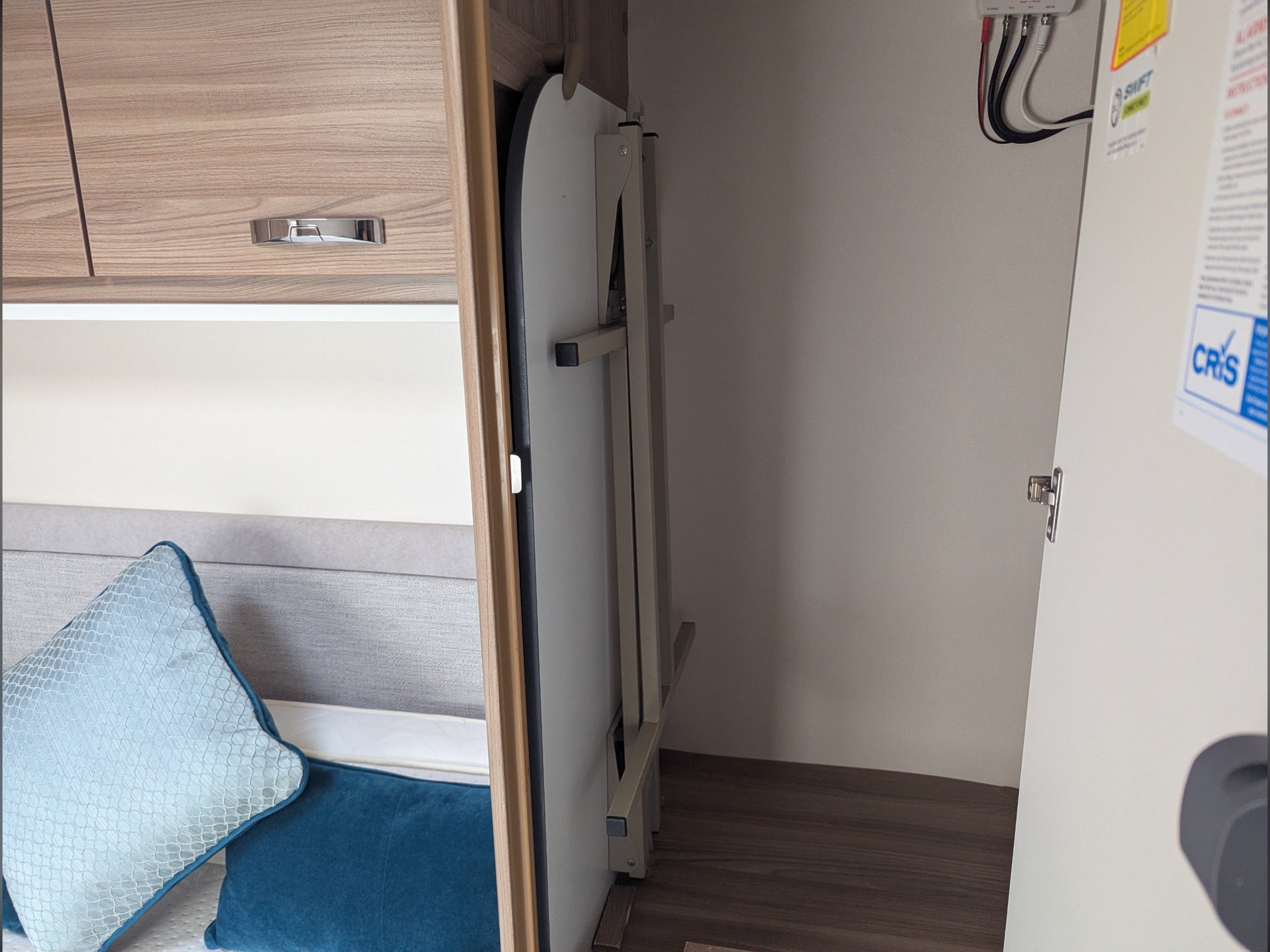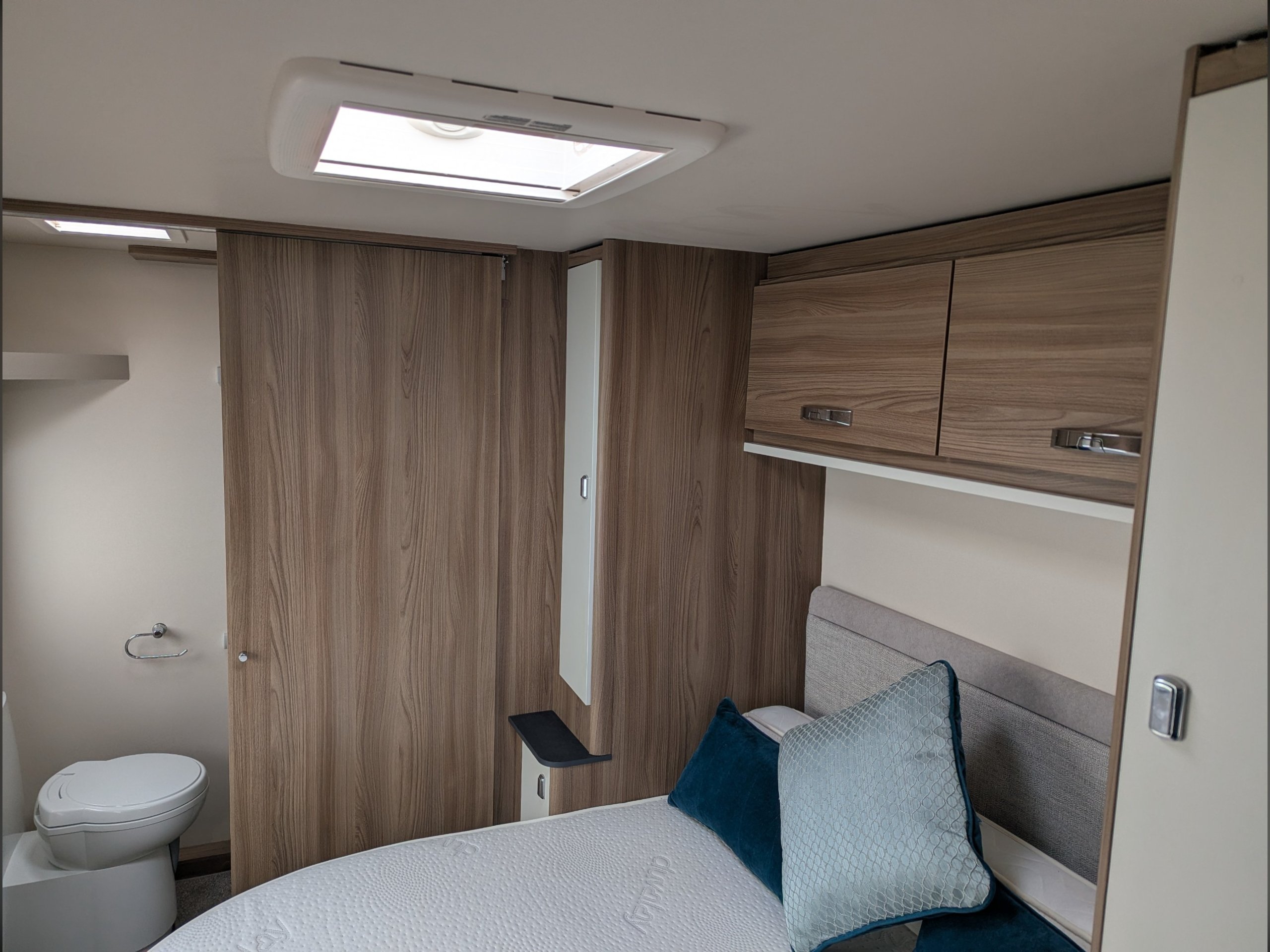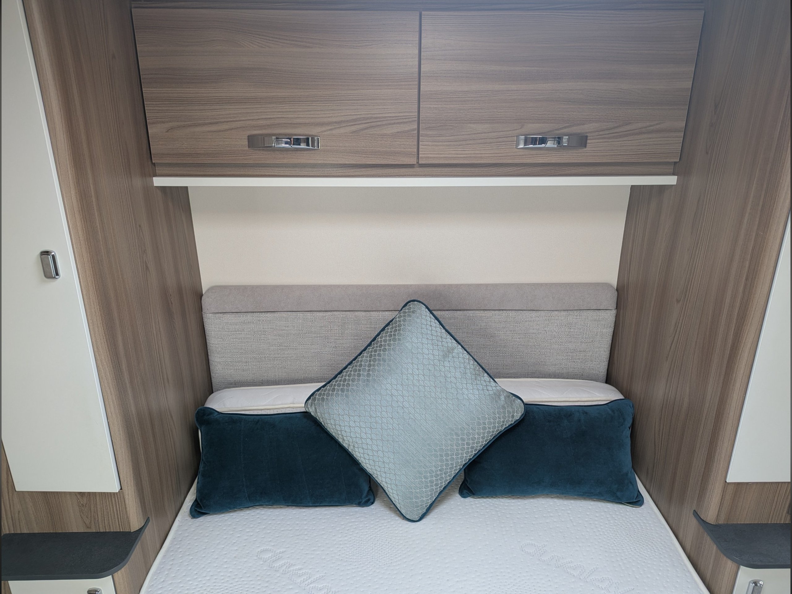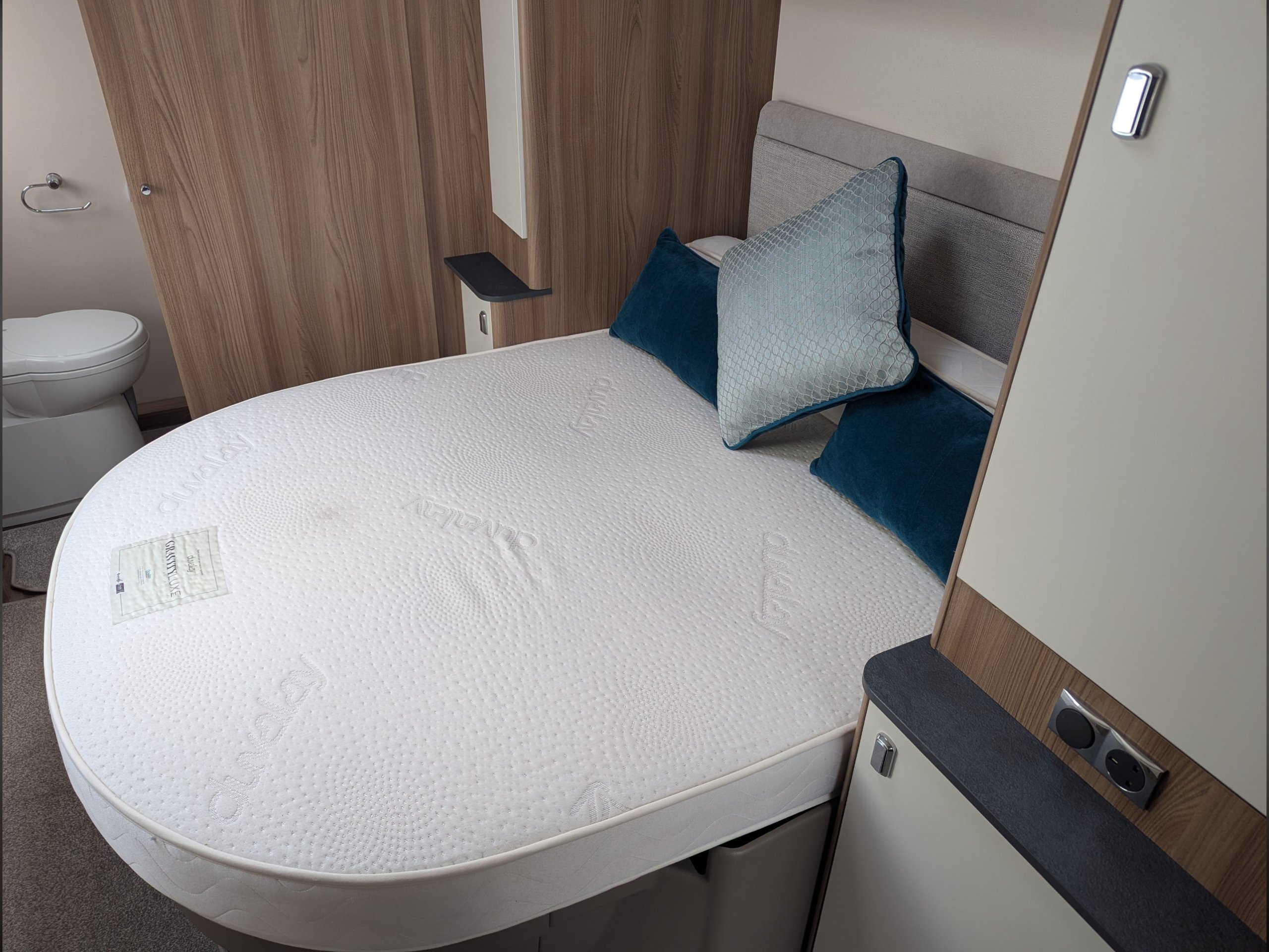 4 berth, single axle, transverse island bed layout with rear washroom.