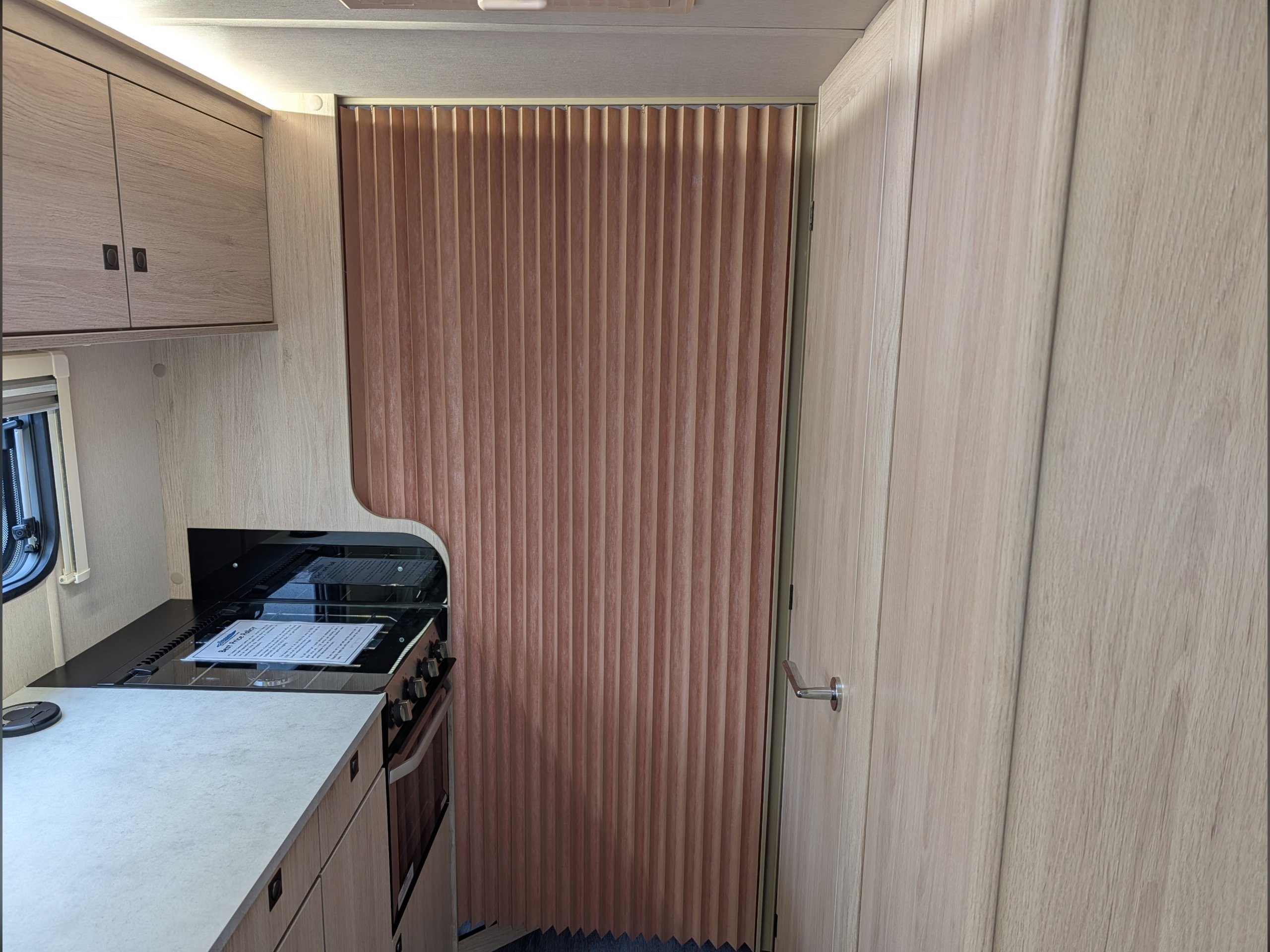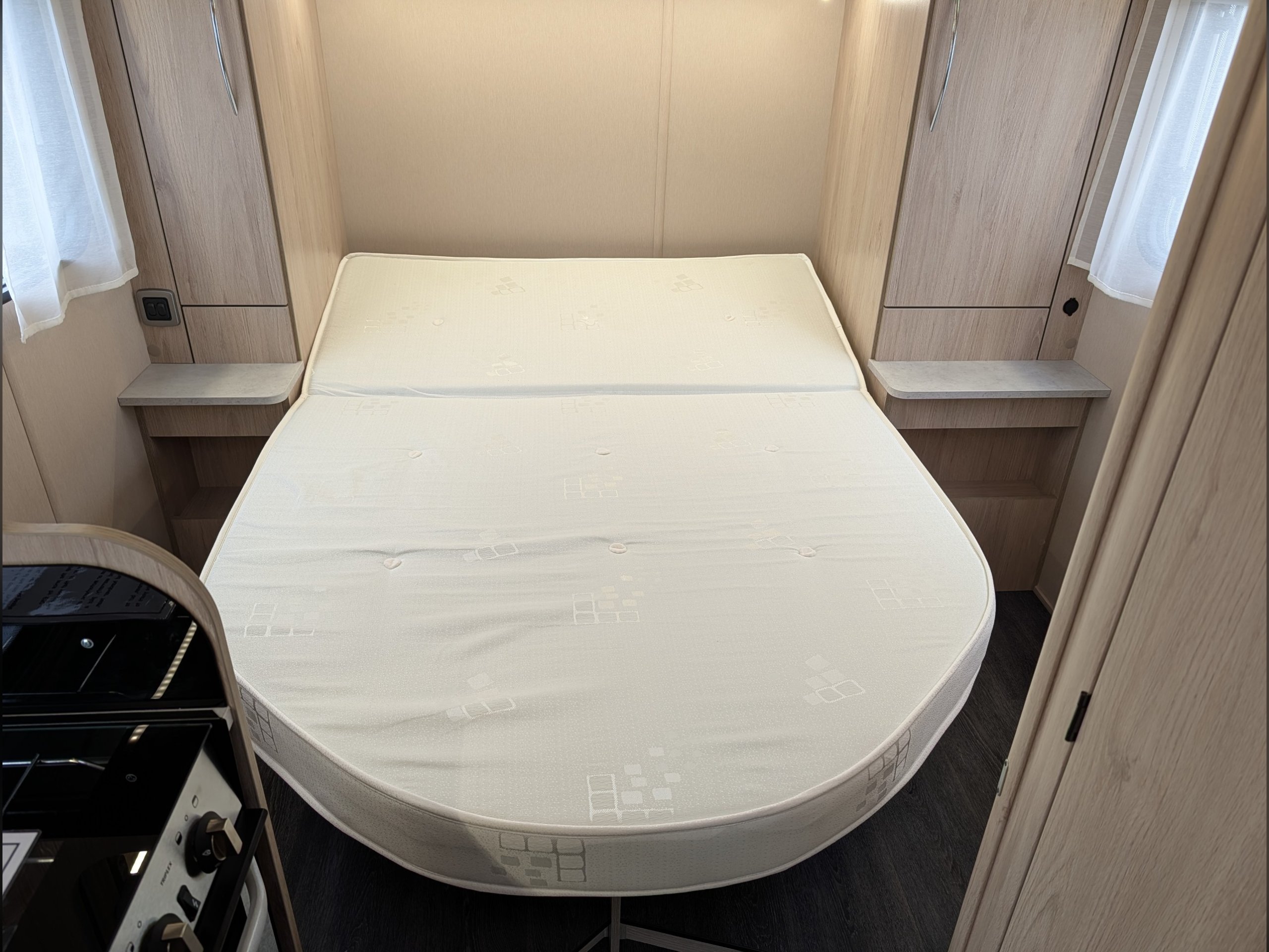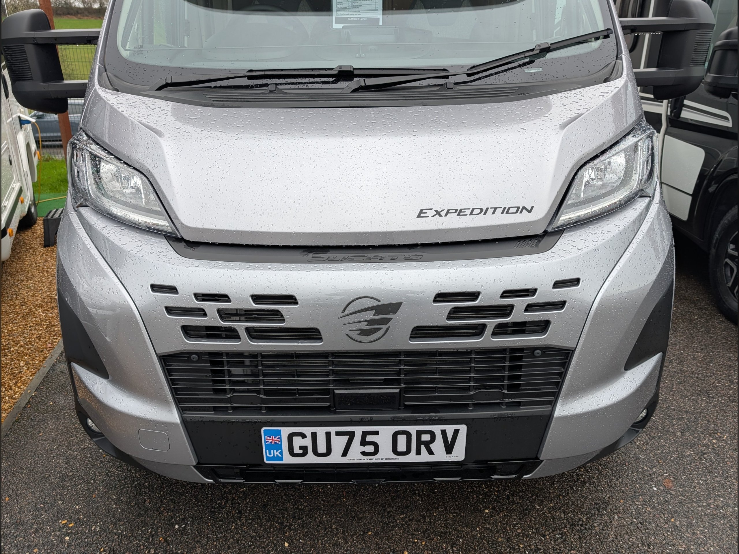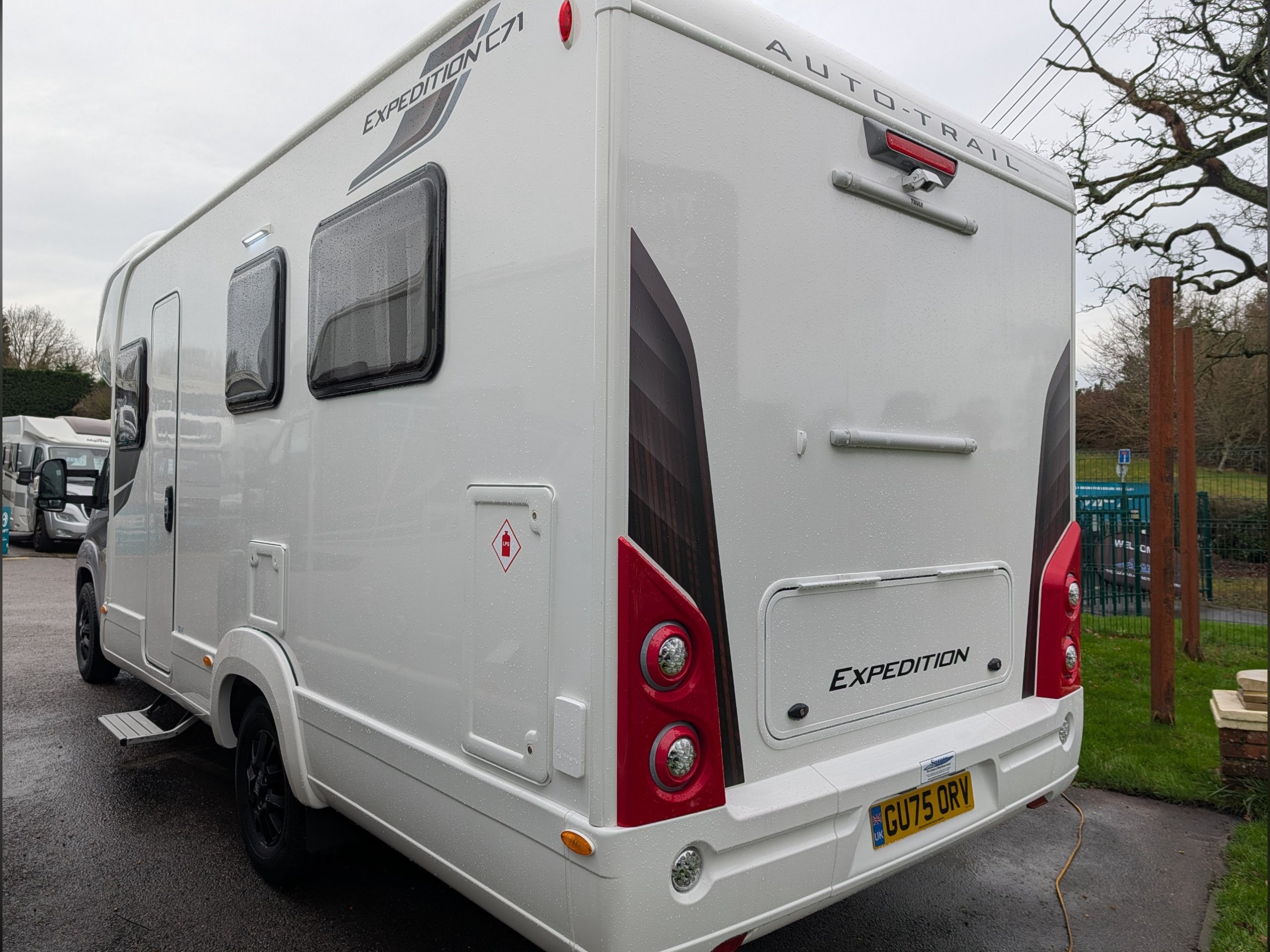 This 2025 Auto-Trail Expedition C71 motorhome has two main, separate fixed double sleeping areas: a rear island bed which can be sectioned off to create a private en-suite bedroom, and another double bed in the over-cab area.