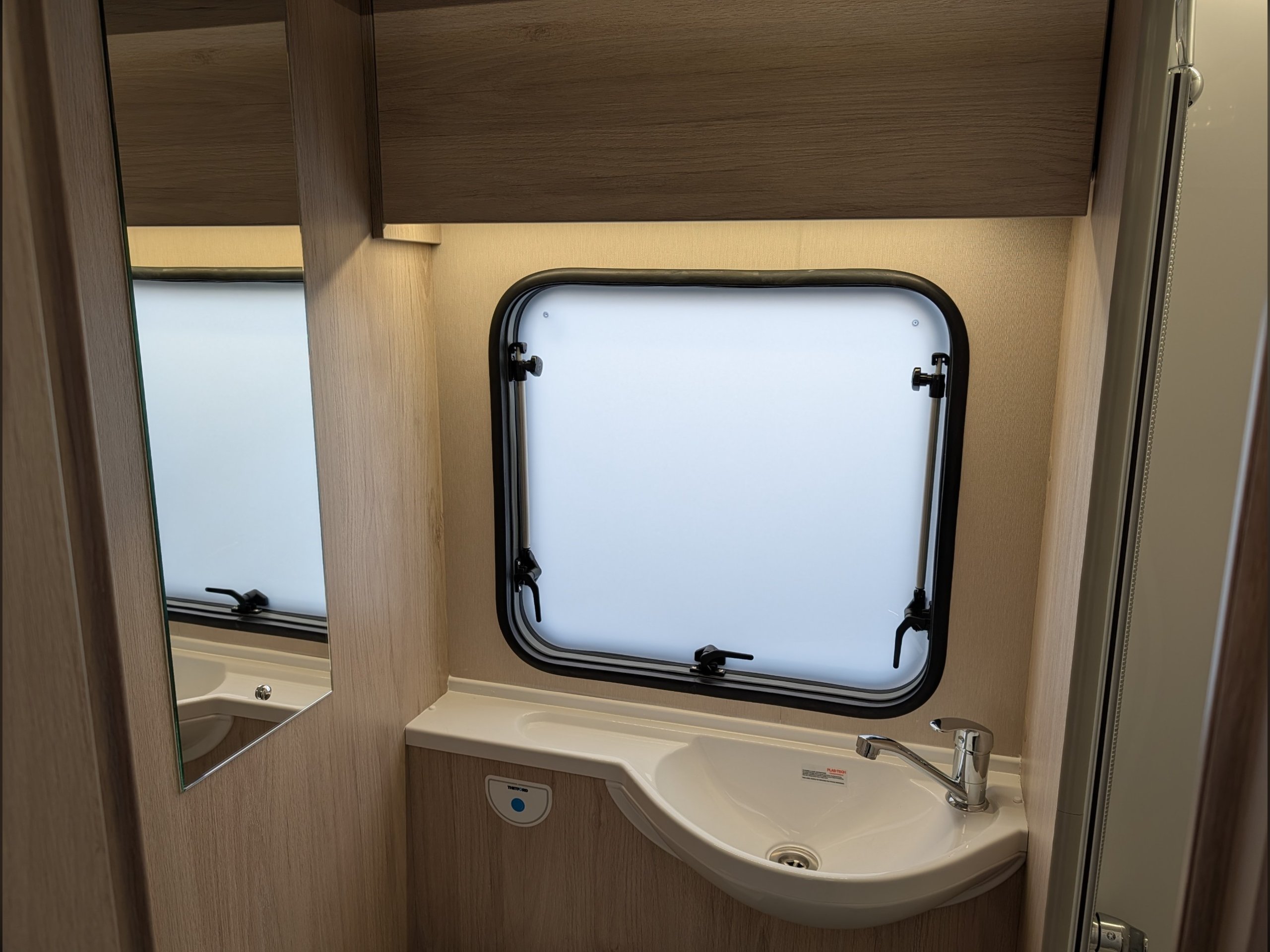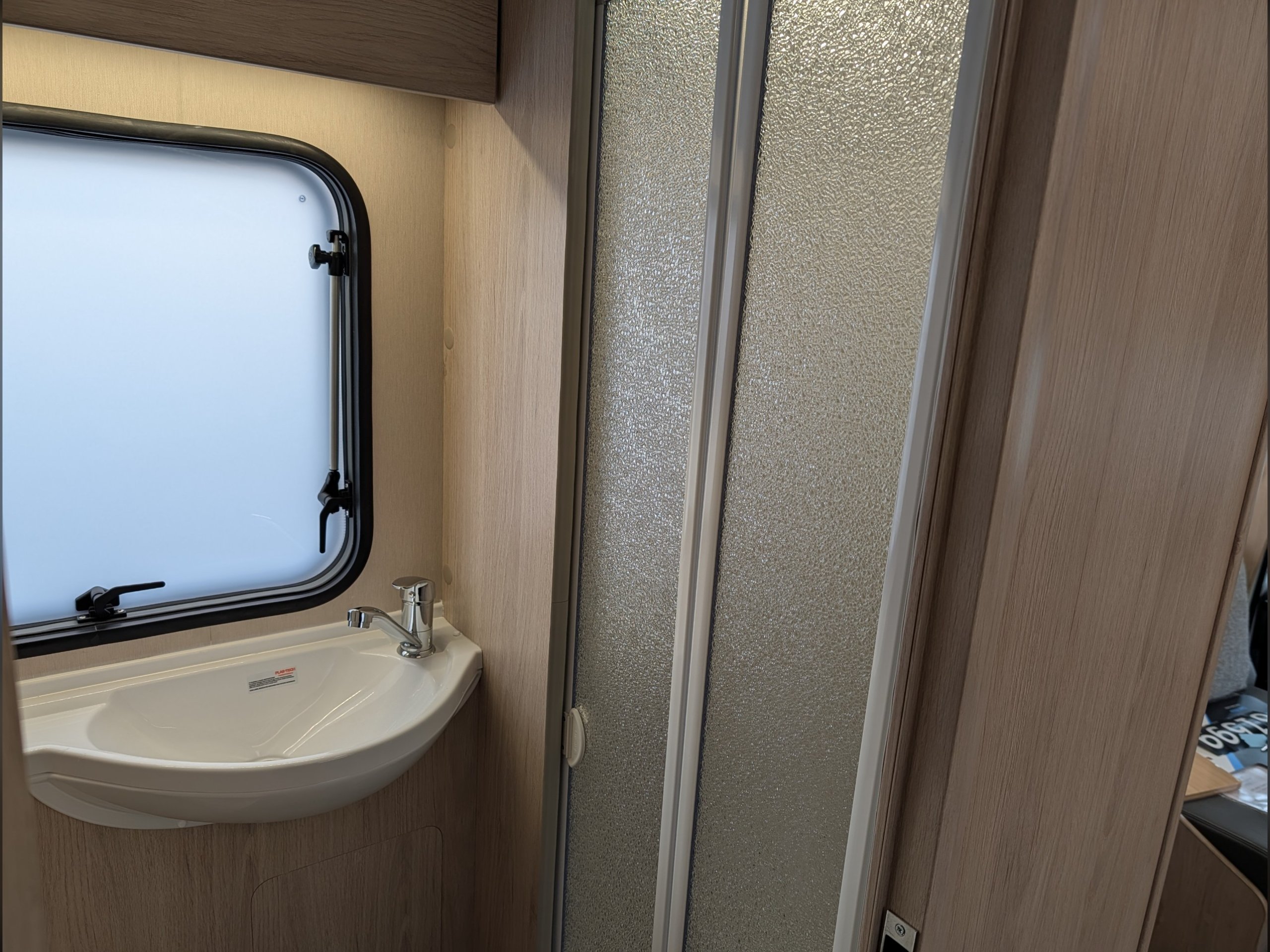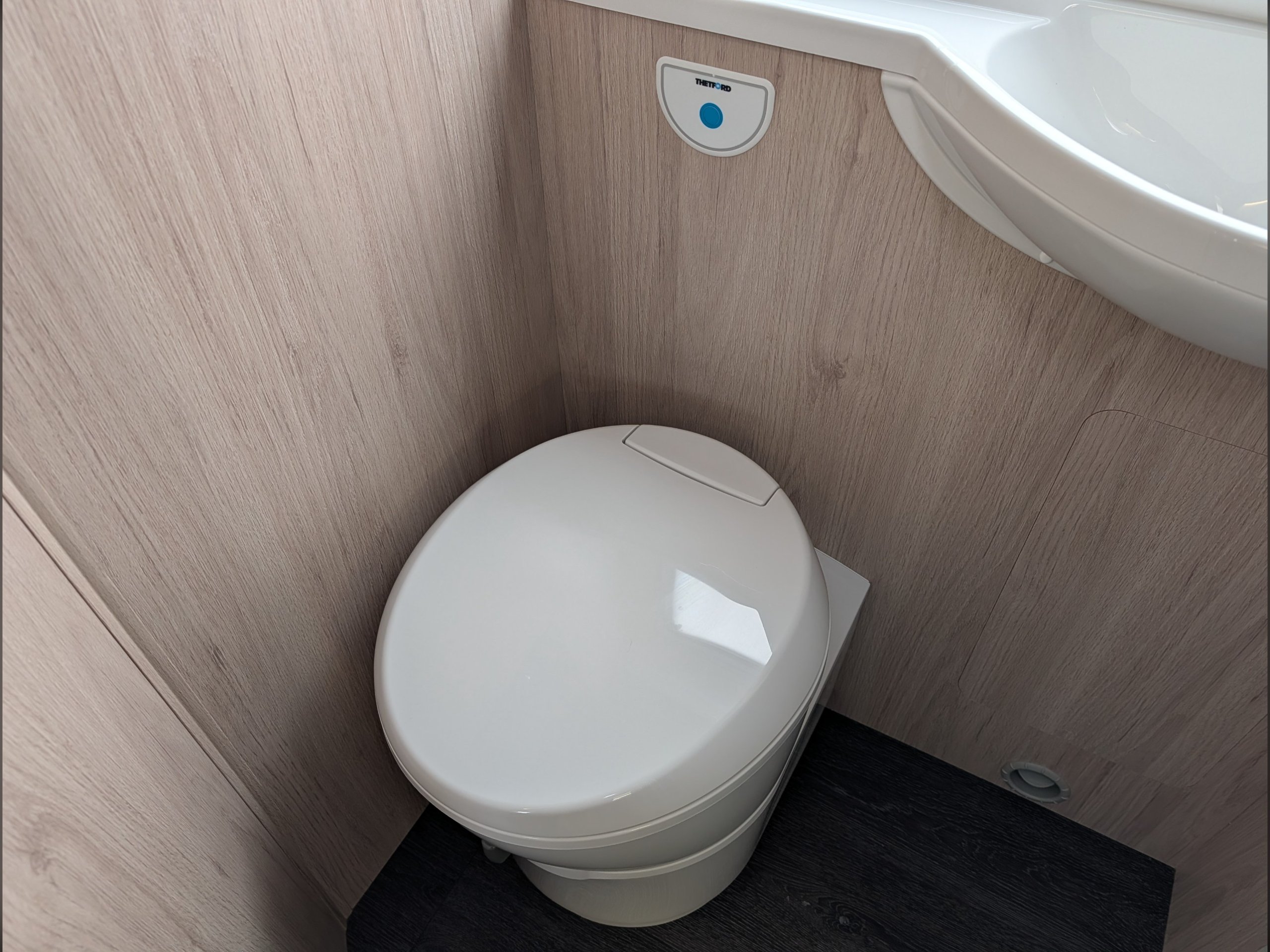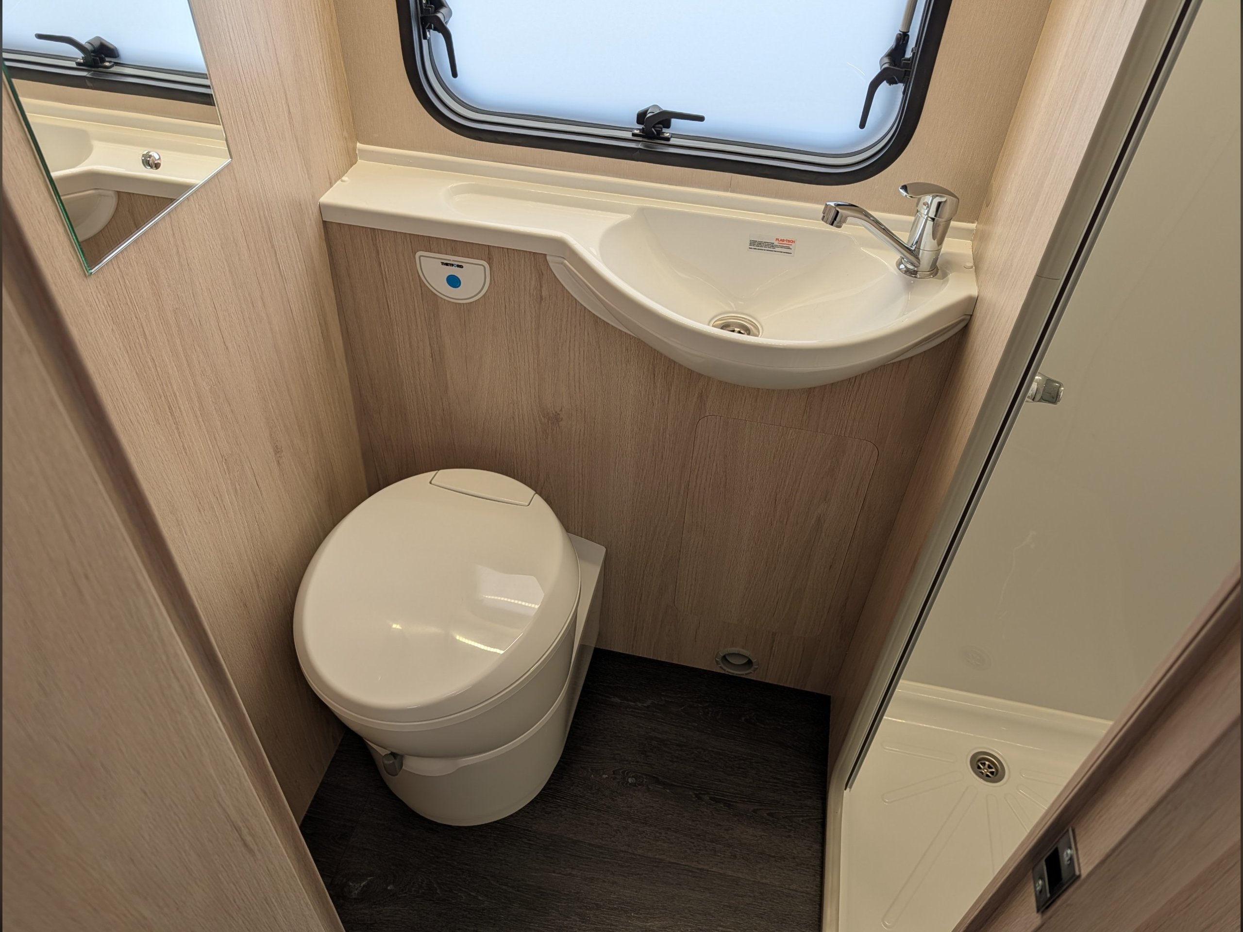 The washroom area is spacious and includes a cassette toilet and a separate shower cubicle.