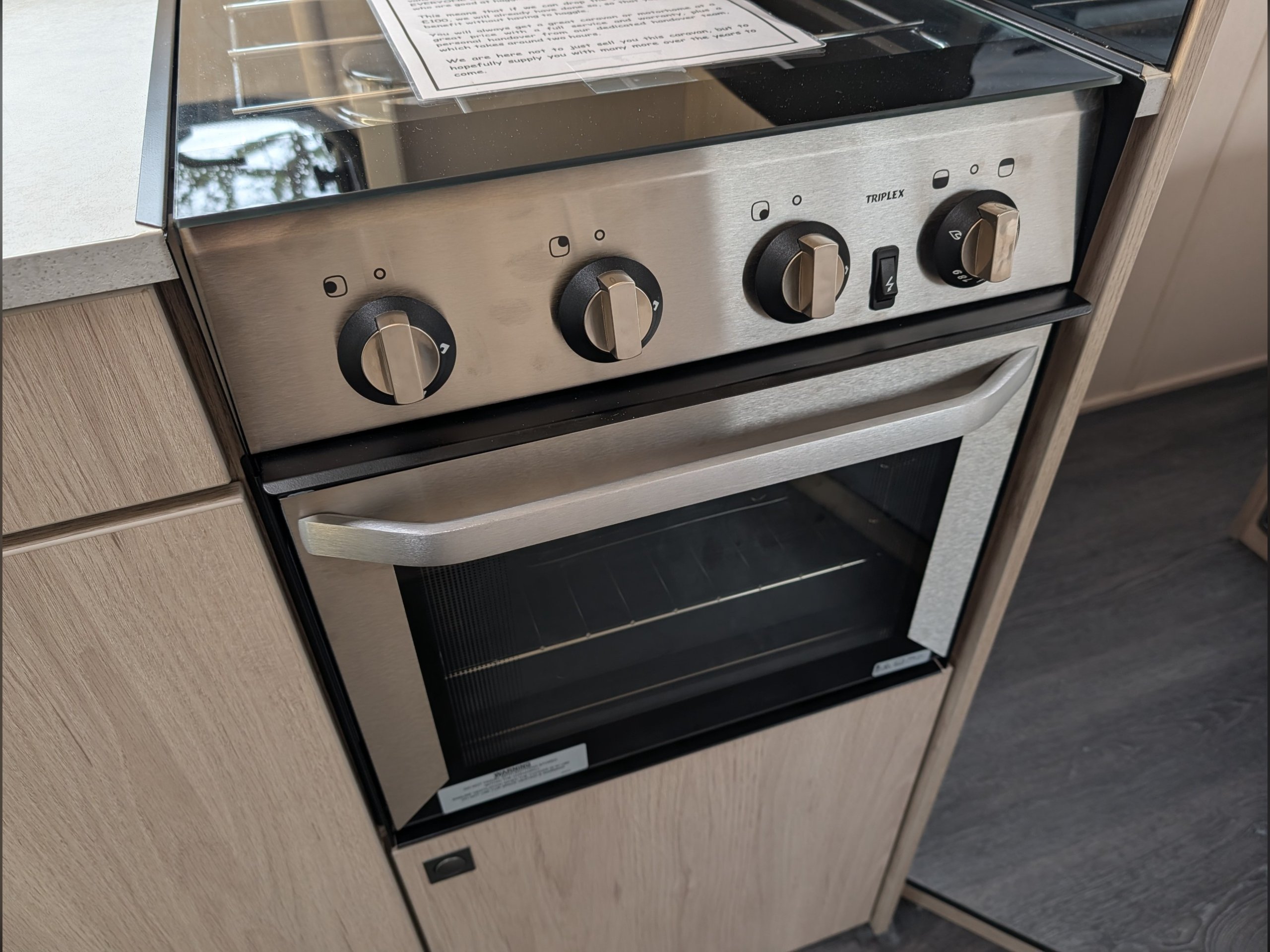 A well-equipped galley kitchen has a 3-burner gas hob, a full oven and grill, a sink with a glass lid, and a fridge/freezer.