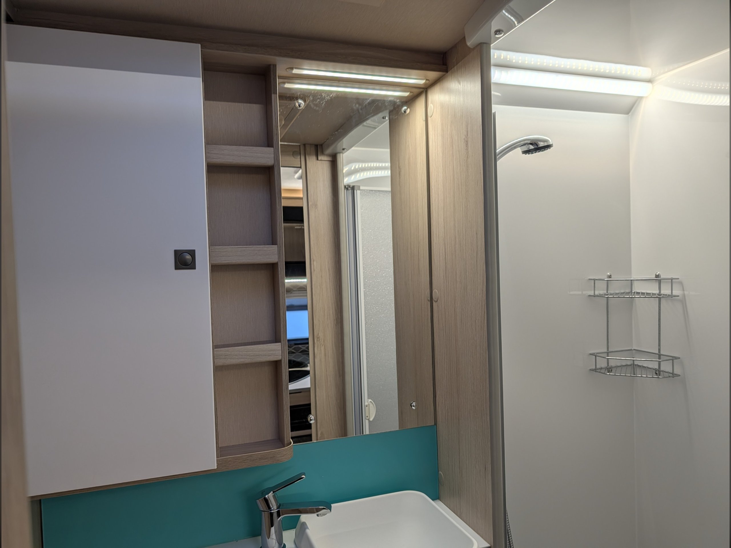 In the washroom is a cleverly designed interior that includes a toilet, hand basin, and a separate walk-in shower cubicle.