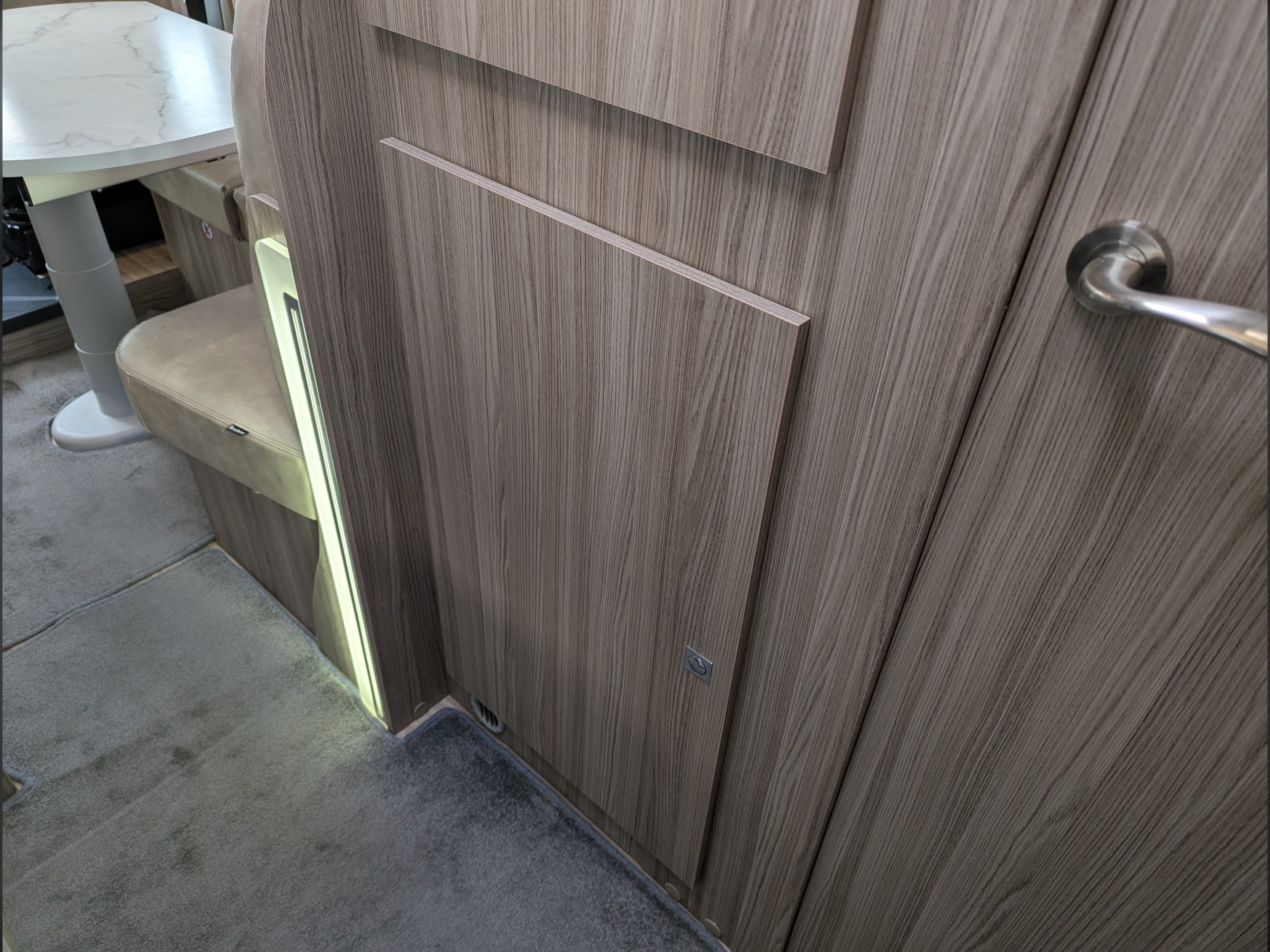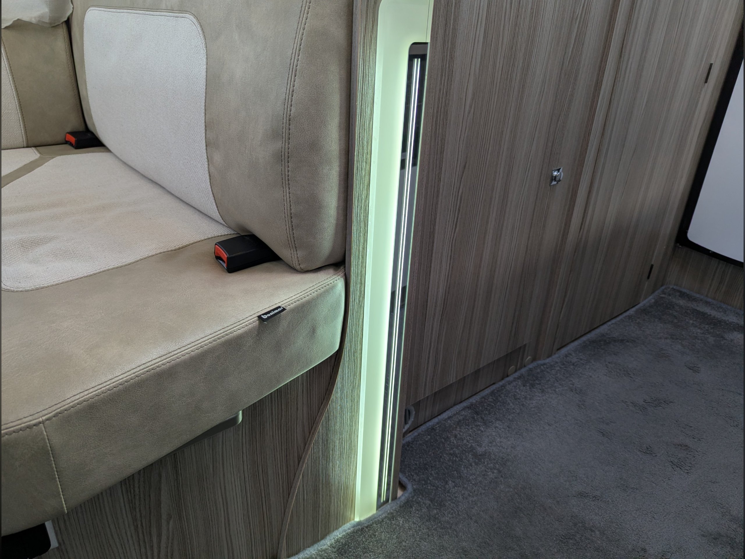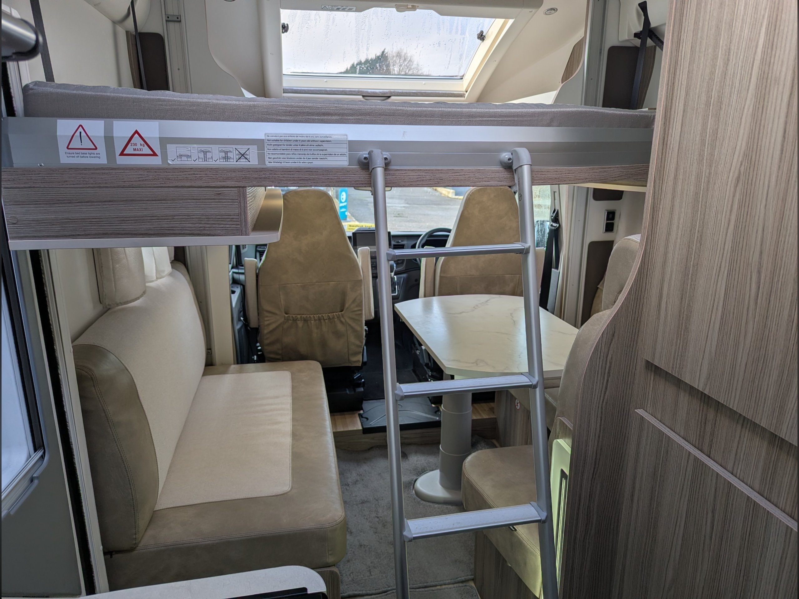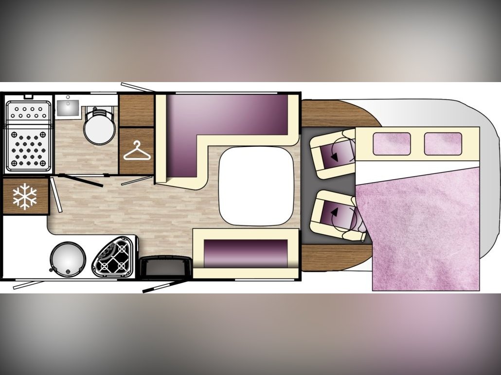 4 berth, 4 belt motorhome with rear kitchen/washroom layout, drop down bed and side dinette. Features solar panel, towbar, rear view camera, and rotating seats.