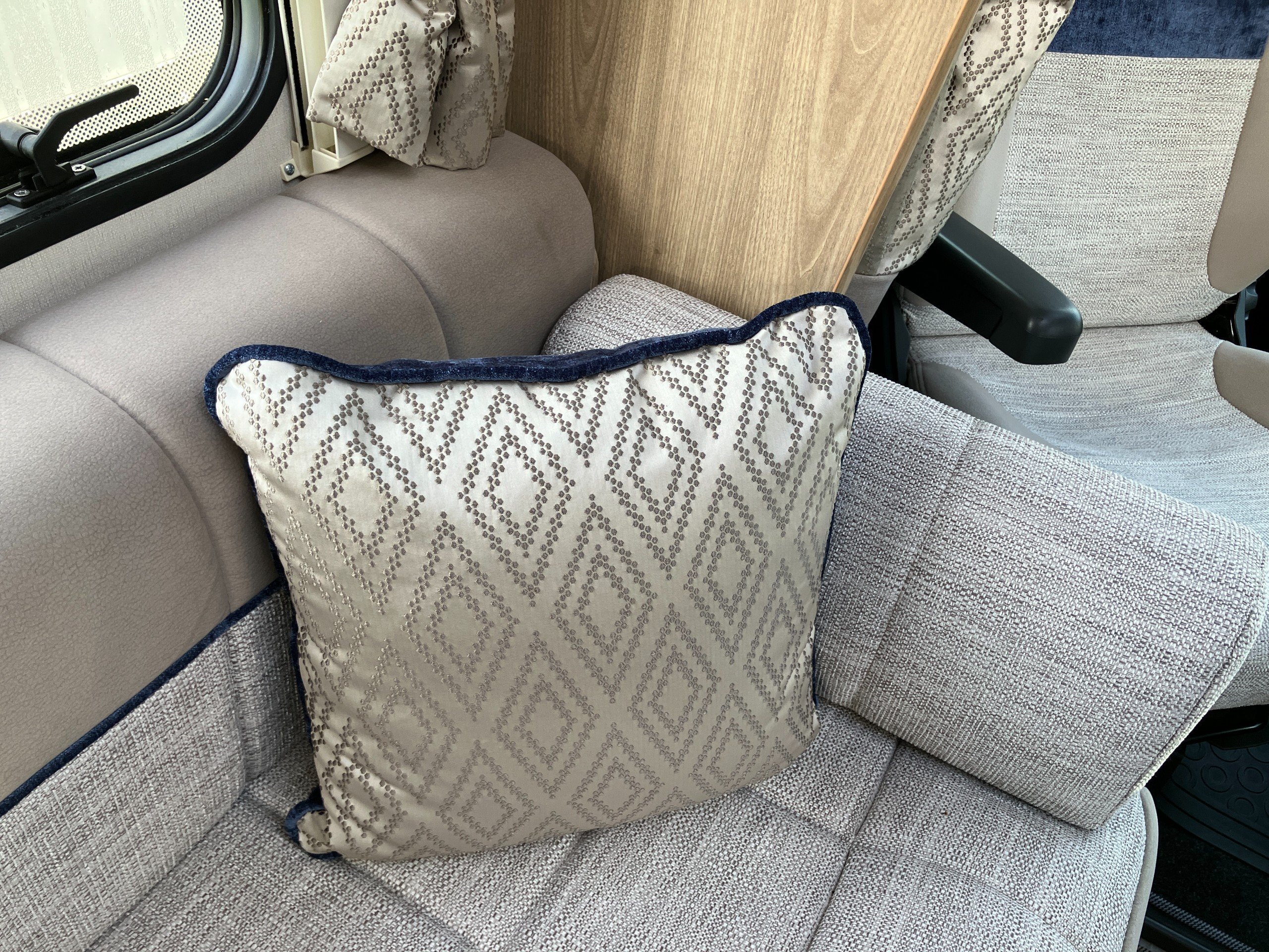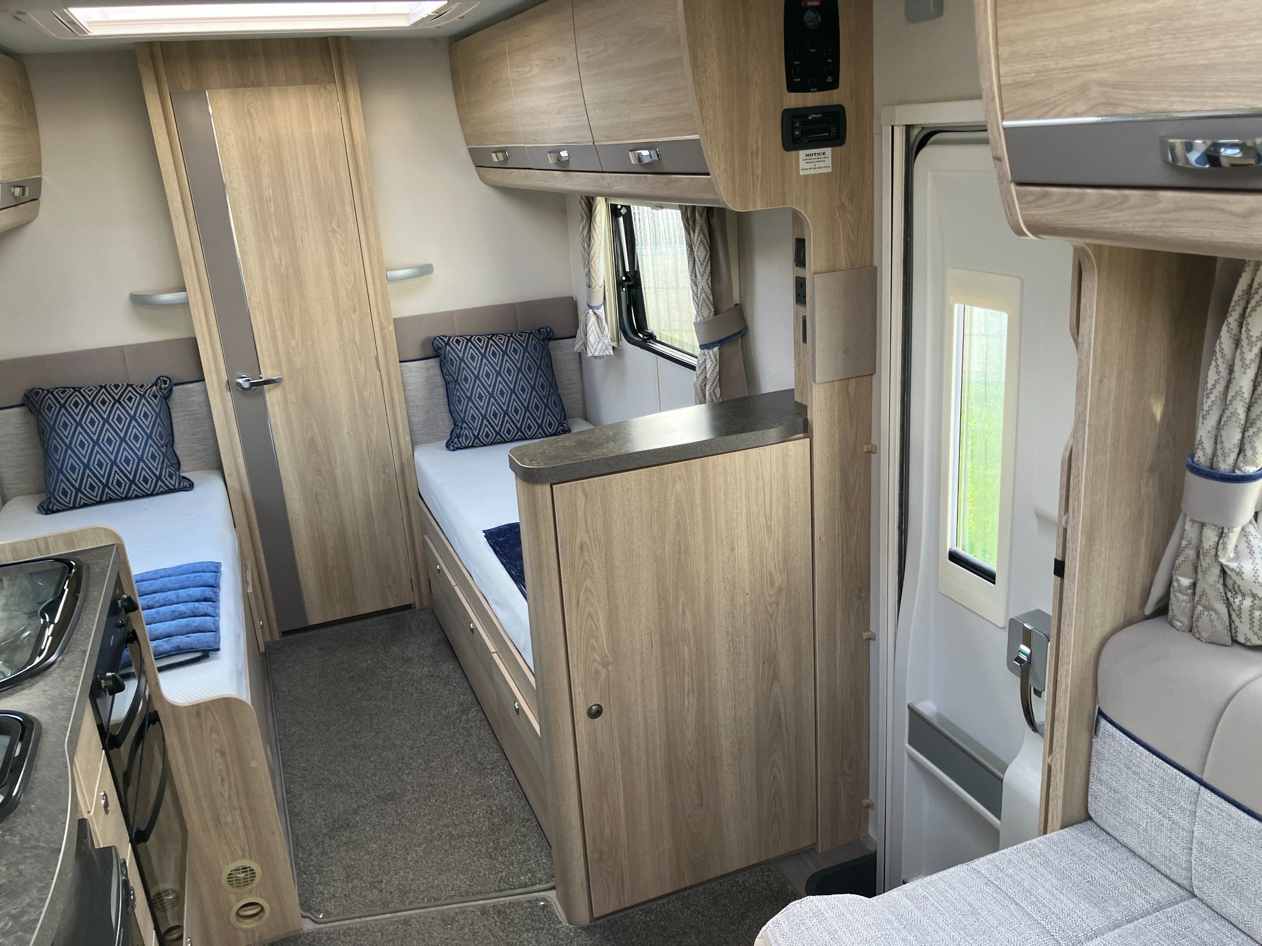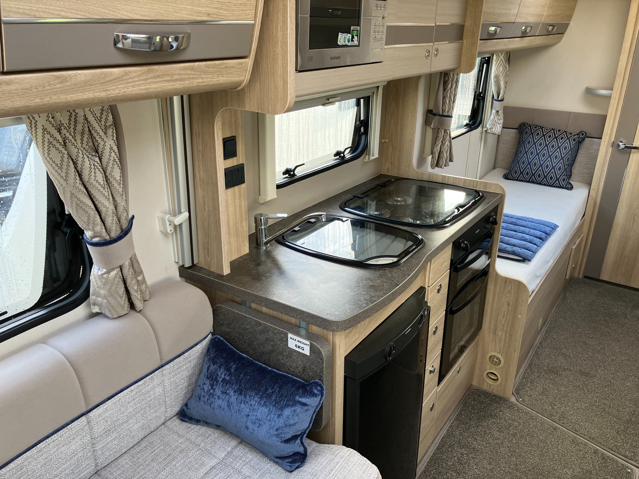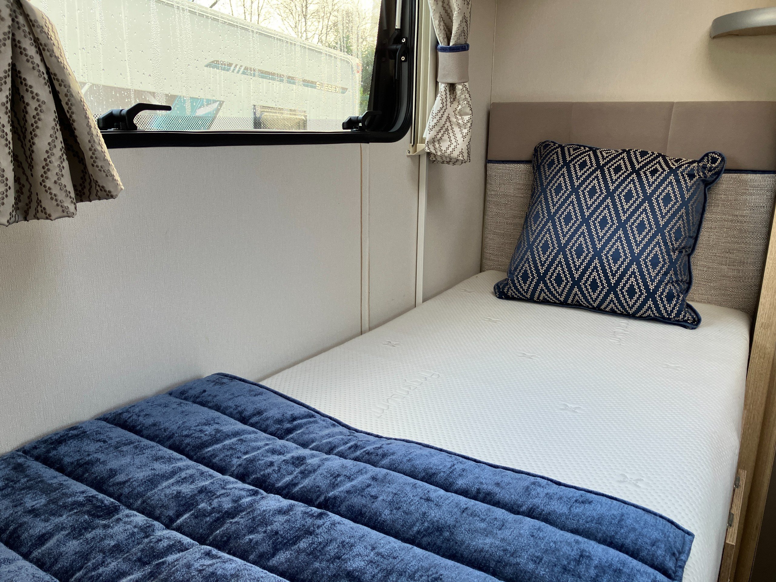 Very low mileage Sussex Special Edition model with bespoke soft furnishings and exclusive graphics. This spacious layout with light tone of wood and contemporary finish offers a bright and comfortable living space for any couple or family. Convenient fold away travel seats offer the option of additional travel seats when required, or remove them for additional storage when travel as two. Designed with both style and practicality in mind, this highly desirable model comes with an enhanced specification including: