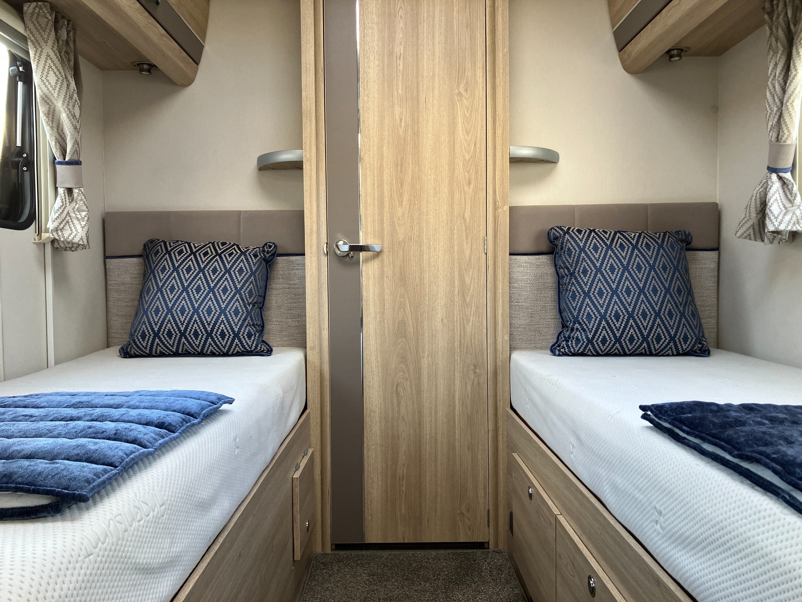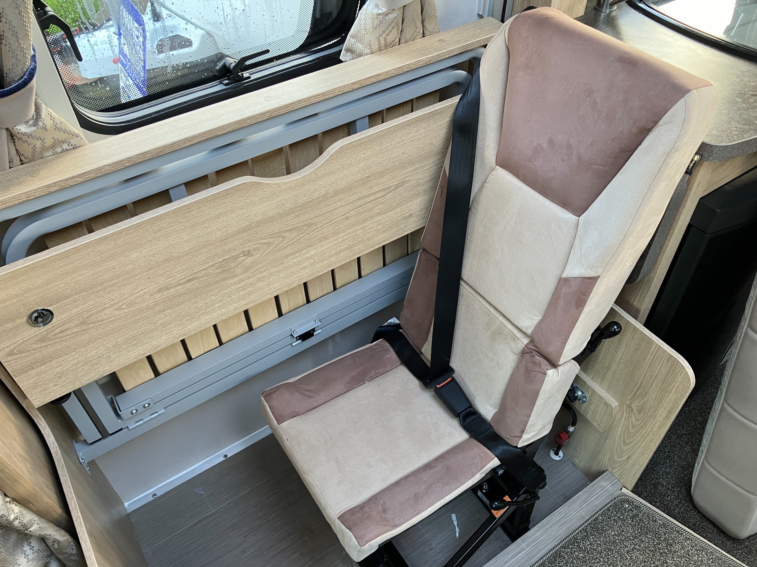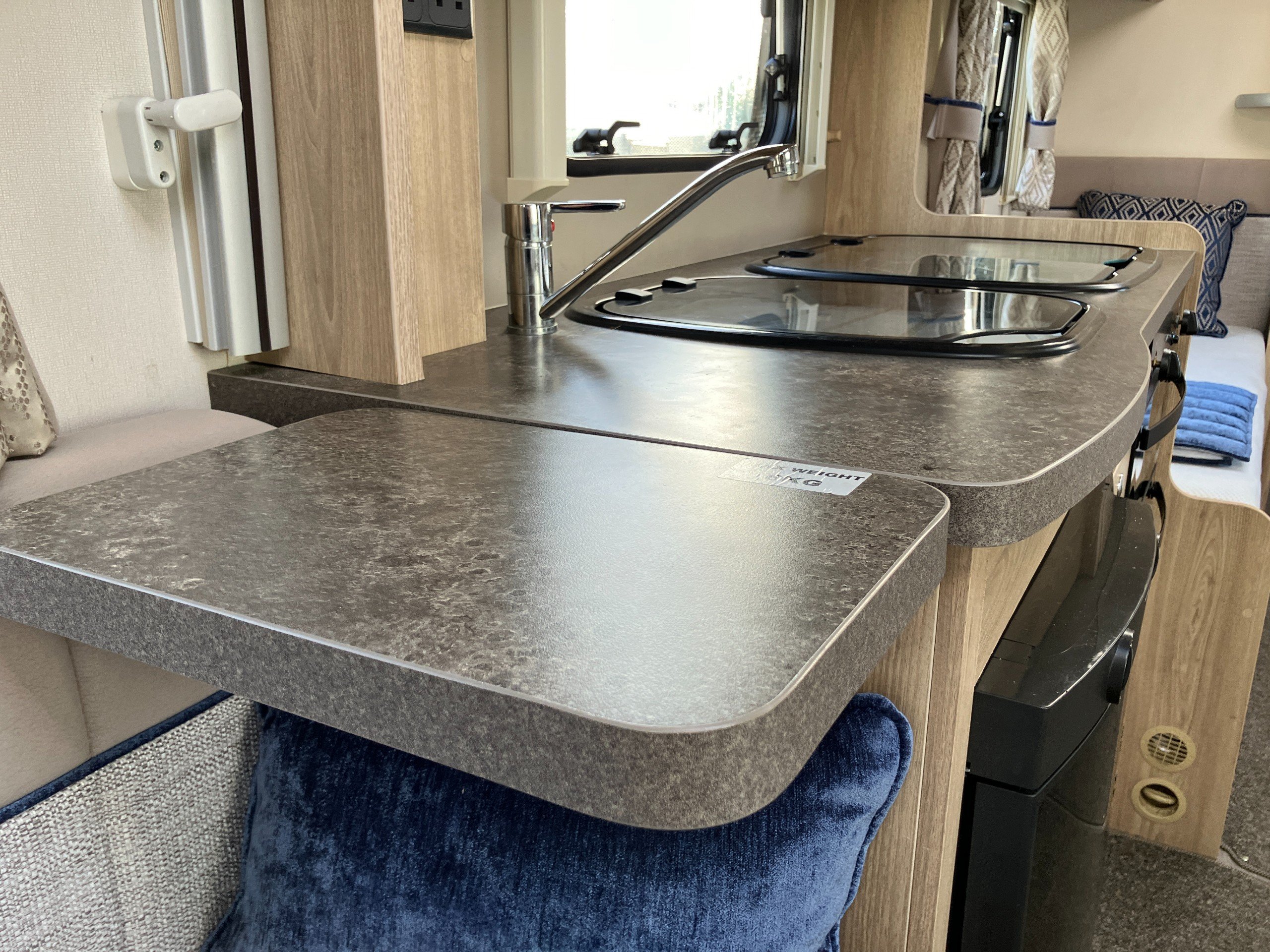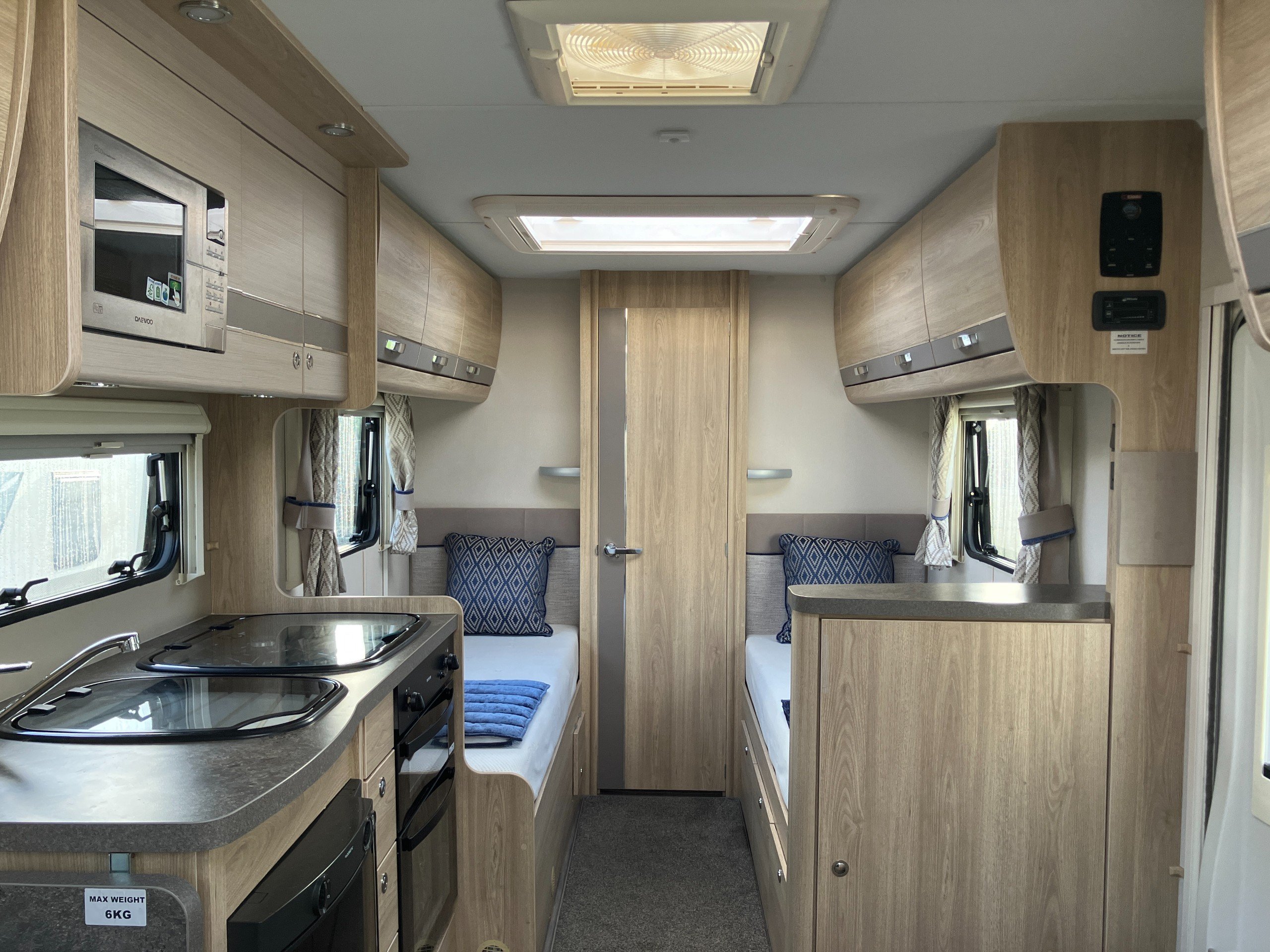 Very low mileage Sussex Special Edition model with bespoke soft furnishings and exclusive graphics. This spacious layout with light tone of wood and contemporary finish offers a bright and comfortable living space for any couple or family. Convenient fold away travel seats offer the option of additional travel seats when required, or remove them for additional storage when travel as two. Designed with both style and practicality in mind, this highly desirable model comes with an enhanced specification including: