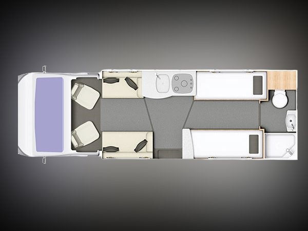 4 berth, 4 belt, fixed single beds, end washroom layout. GVW: 3500kg.