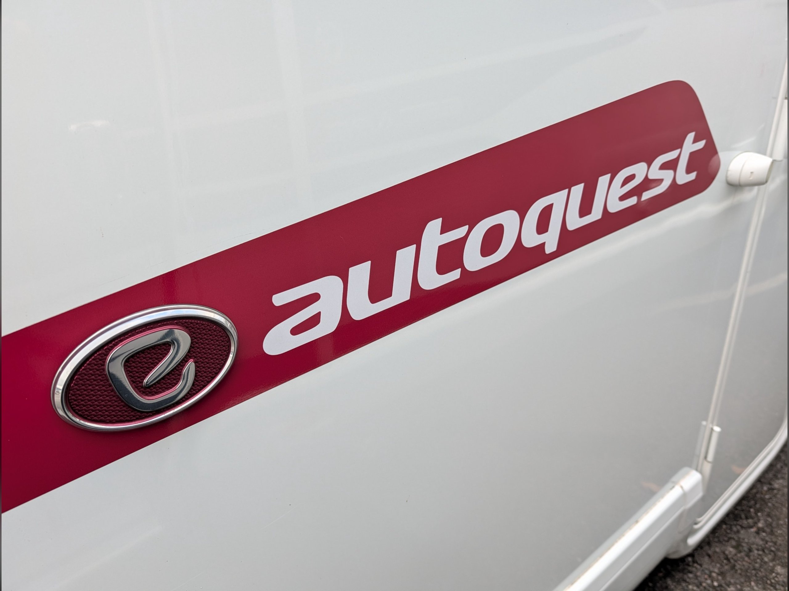 This 2023 Elddis Autoquest 150 layout features a popular rear fixed island bed with wardrobes, a central kitchen and washroom, and a front lounge with parallel bench seats that convert into an extra double bed, offering a flexible 4-berth, 4-travel seat configuration on a Peugeot Boxer chassis.