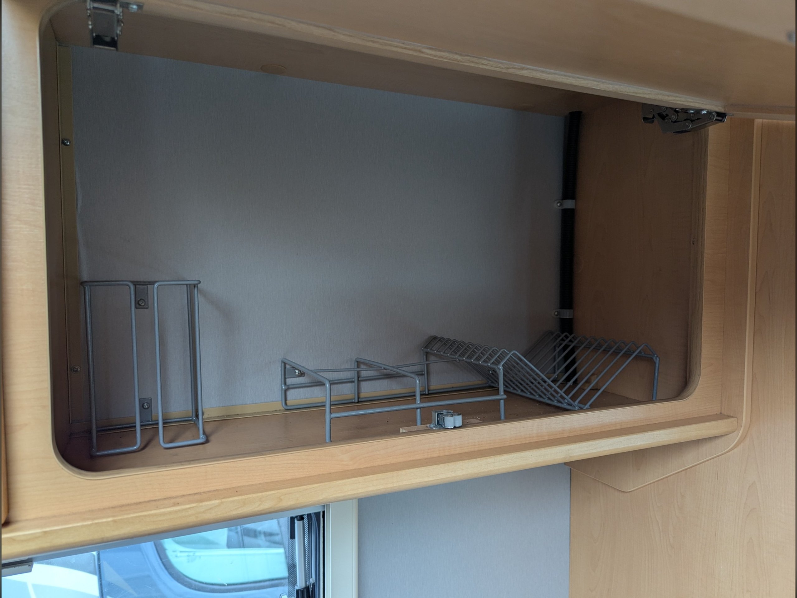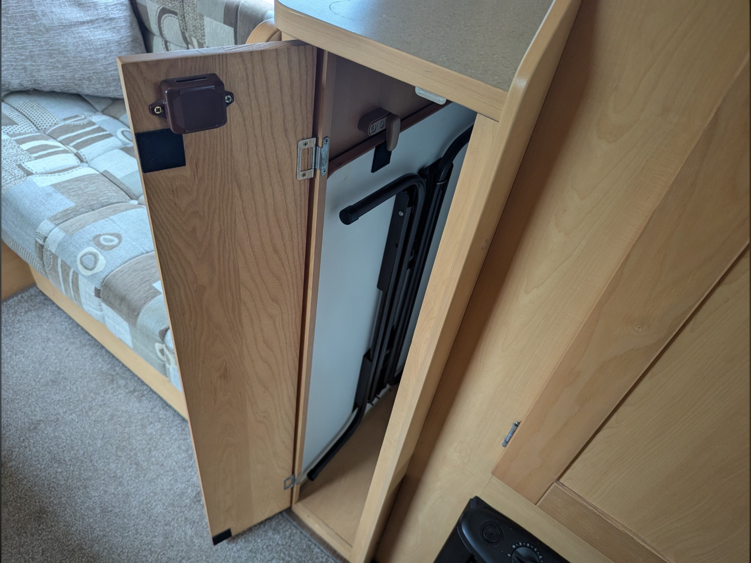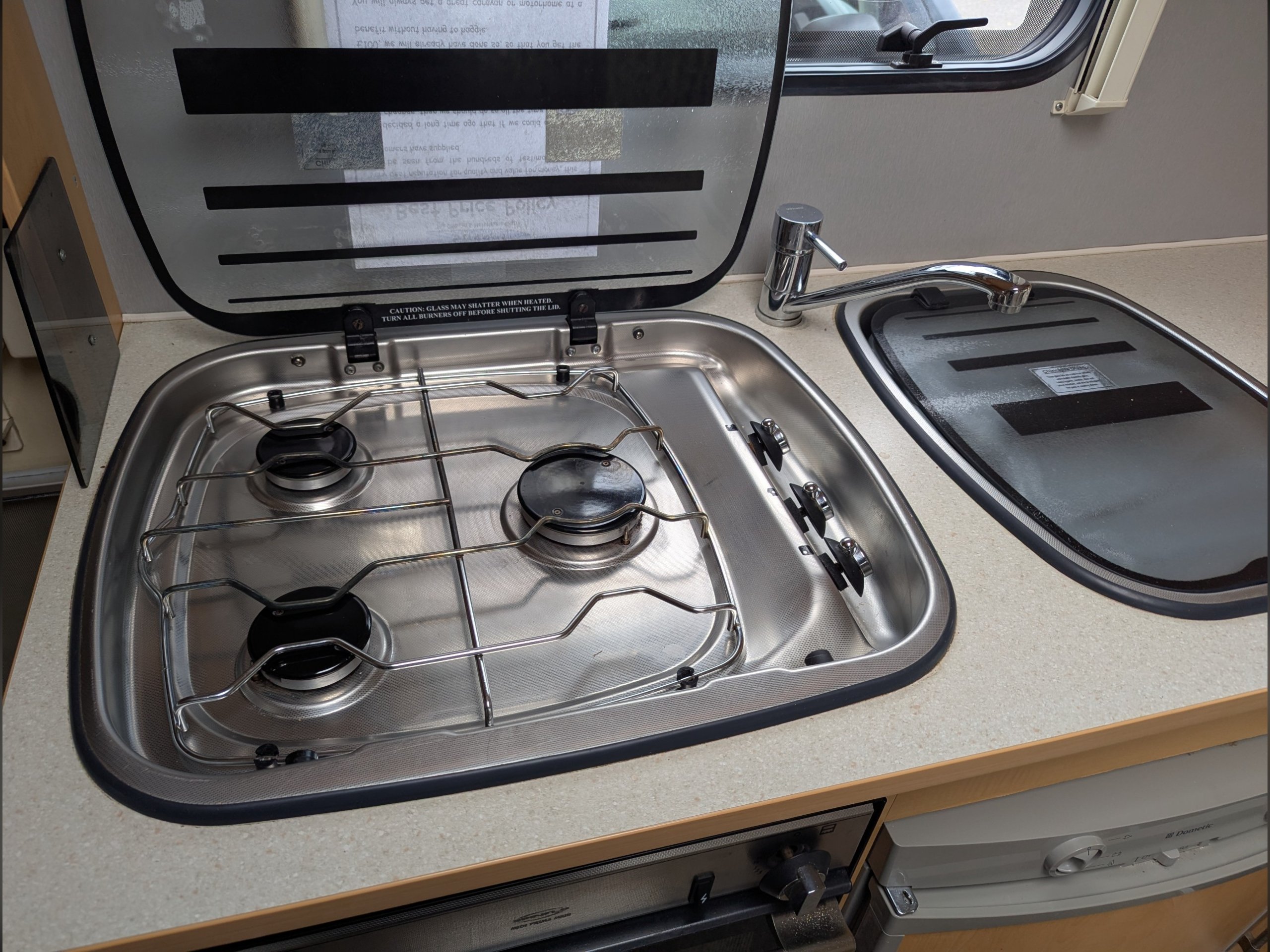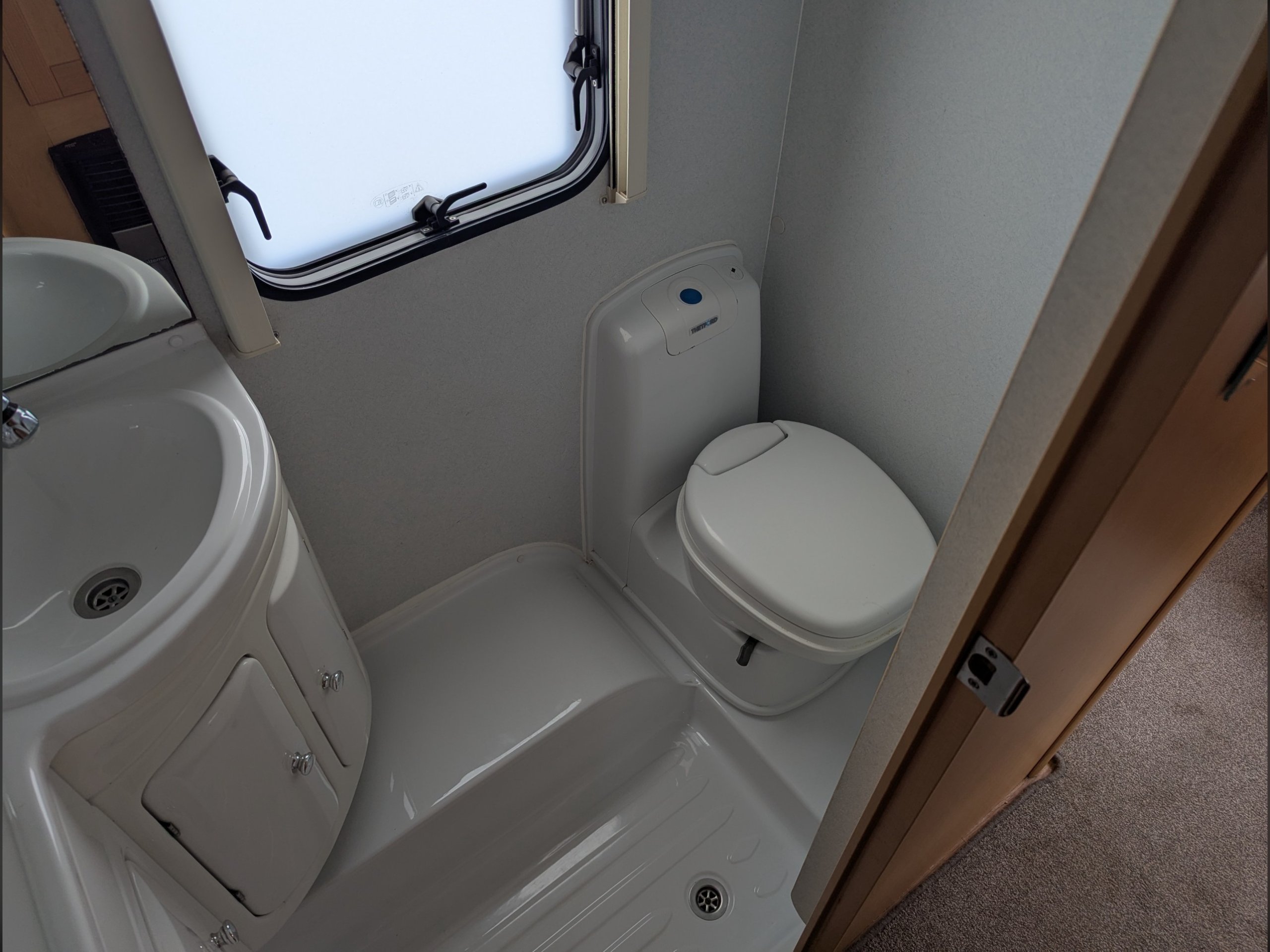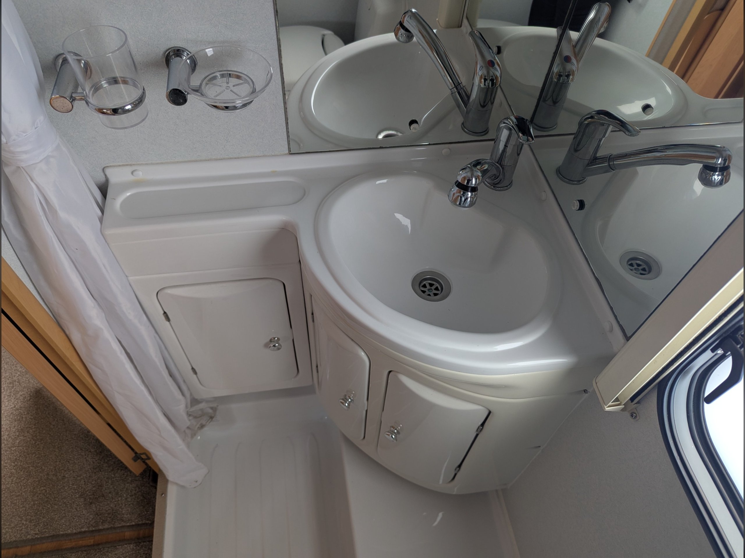 Located opposite the dinette, there is a well equipped kitchen that includes a hob, grill, oven, and fridge and the central washroom has a toilet, basin, and shower.