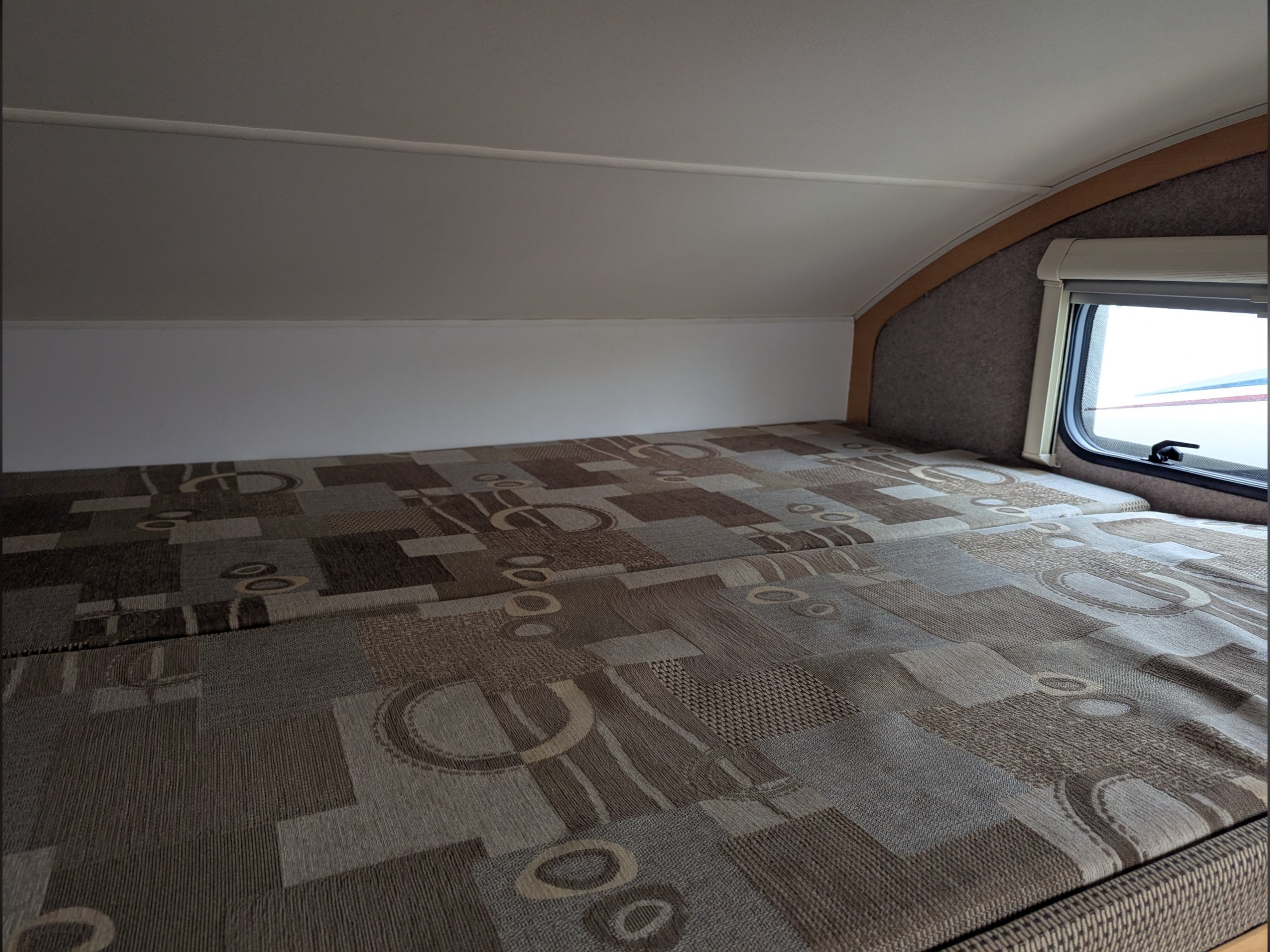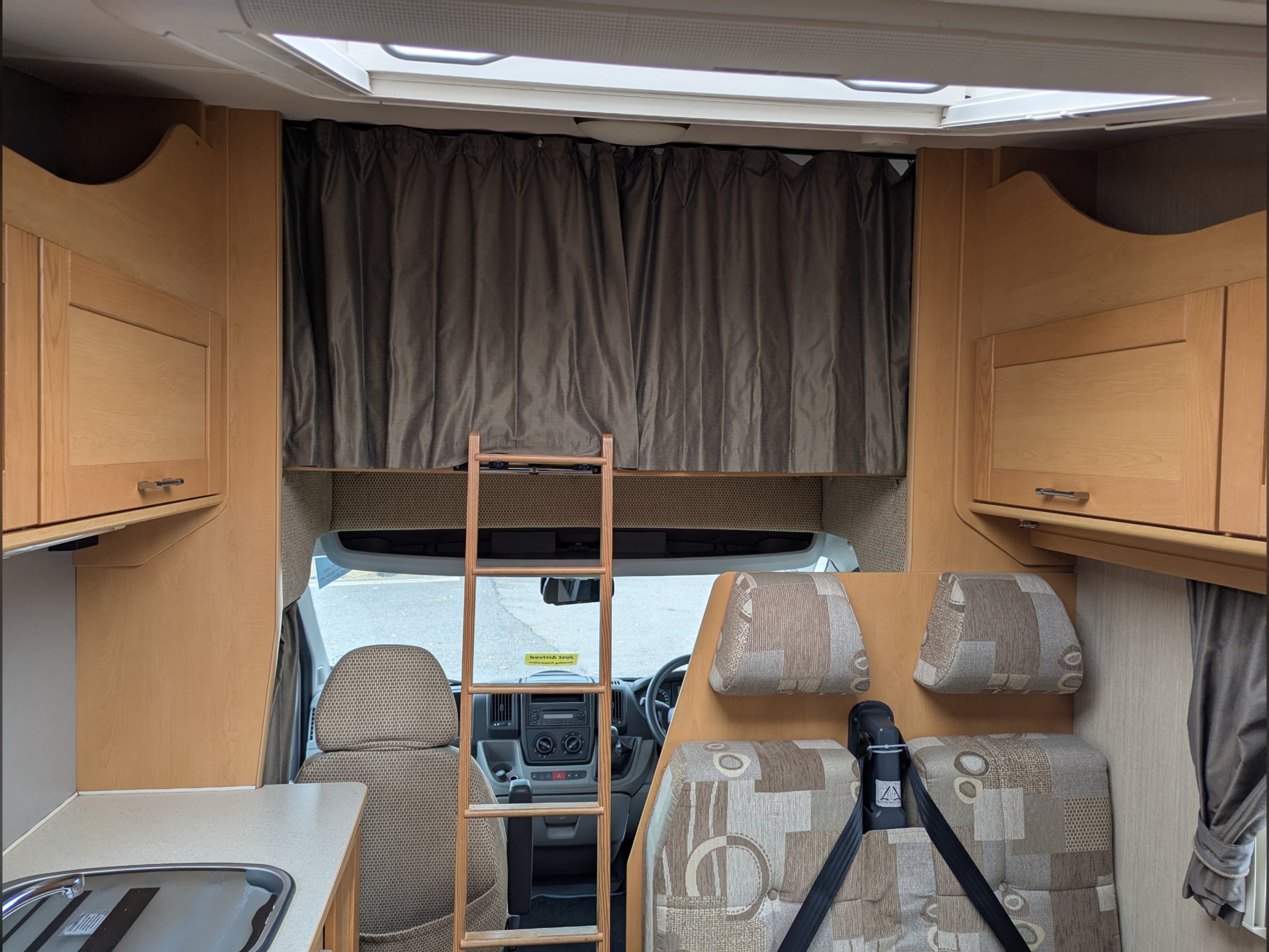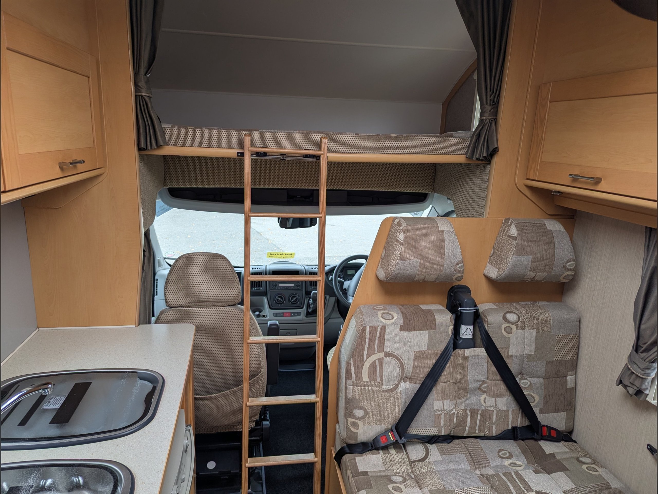 A further double bed is located above the cab, accessible by a ladder and with a safety net.