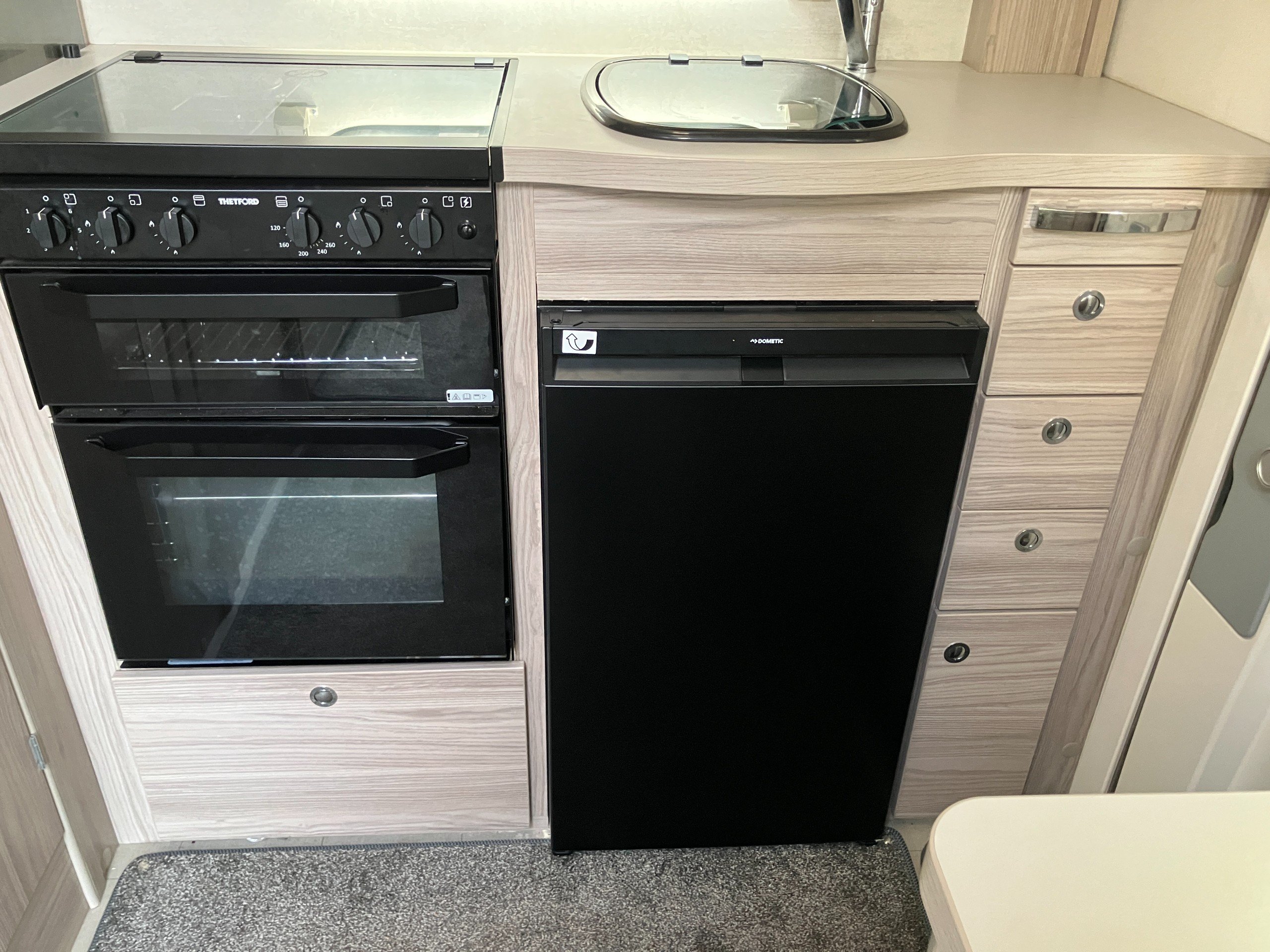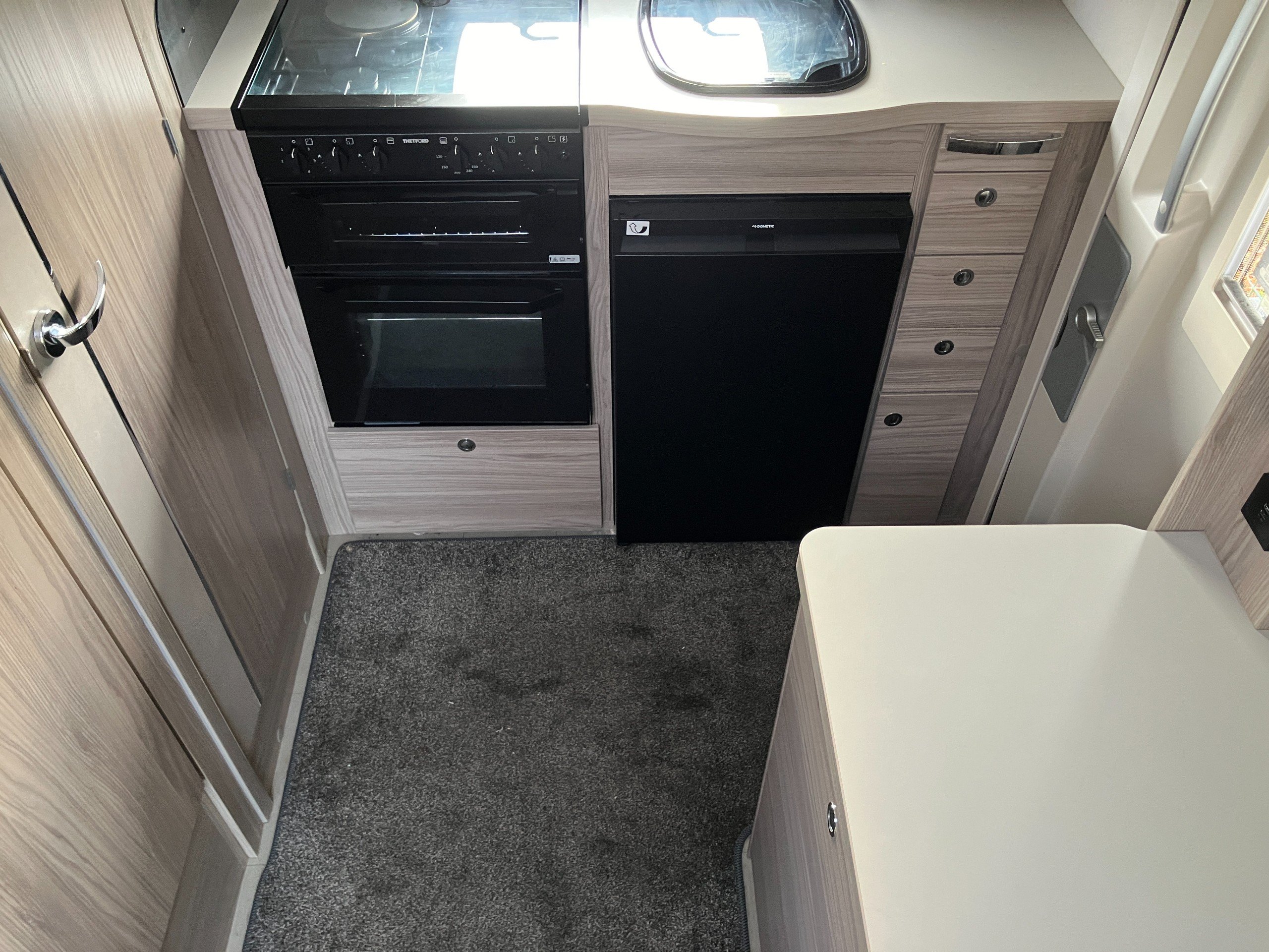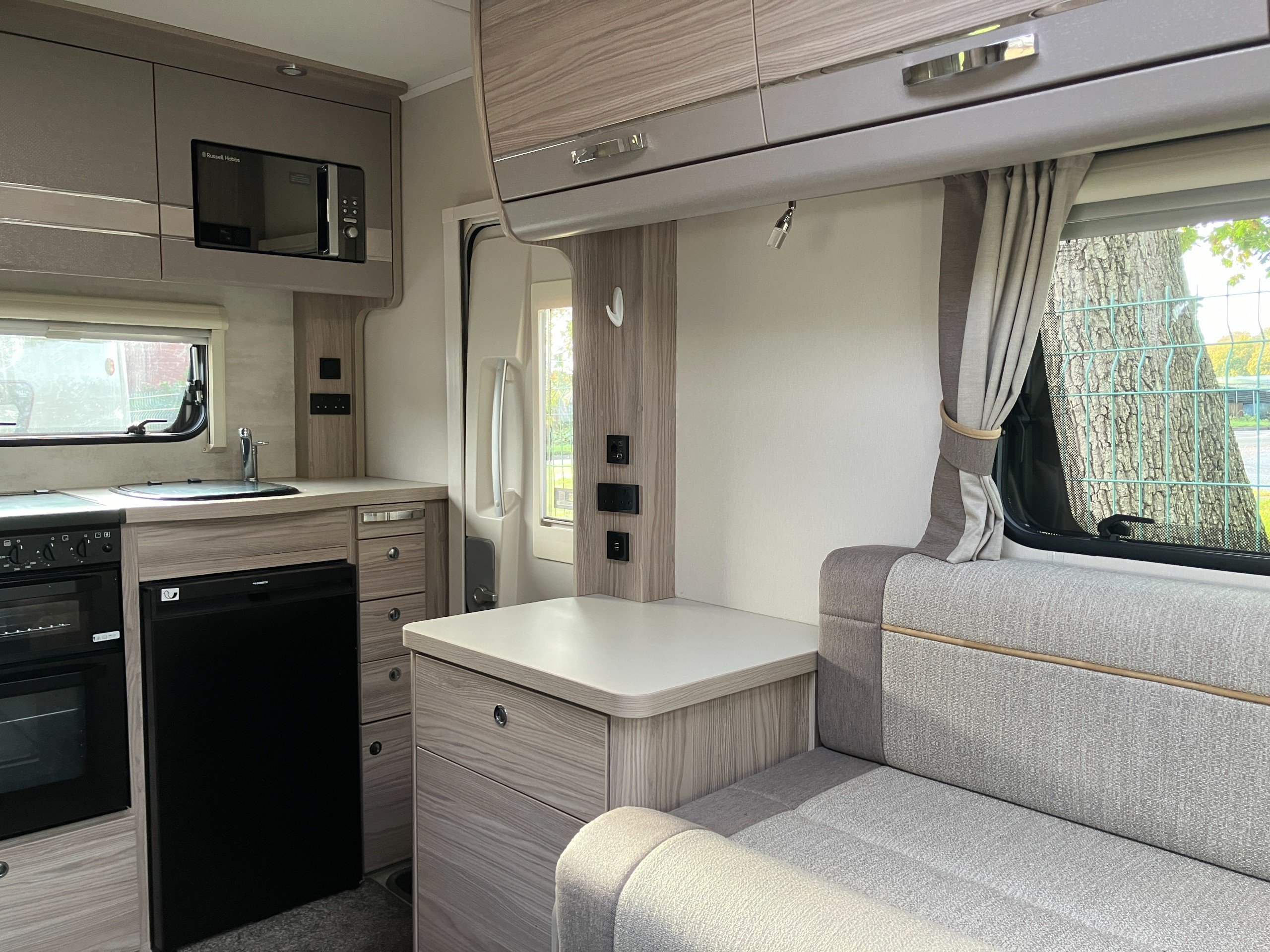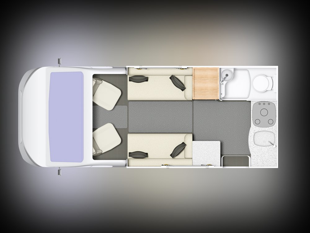 2 berth, 2 belt, lounge conversion, end kitchen, side wetroom layout. GVW: 3300kg.