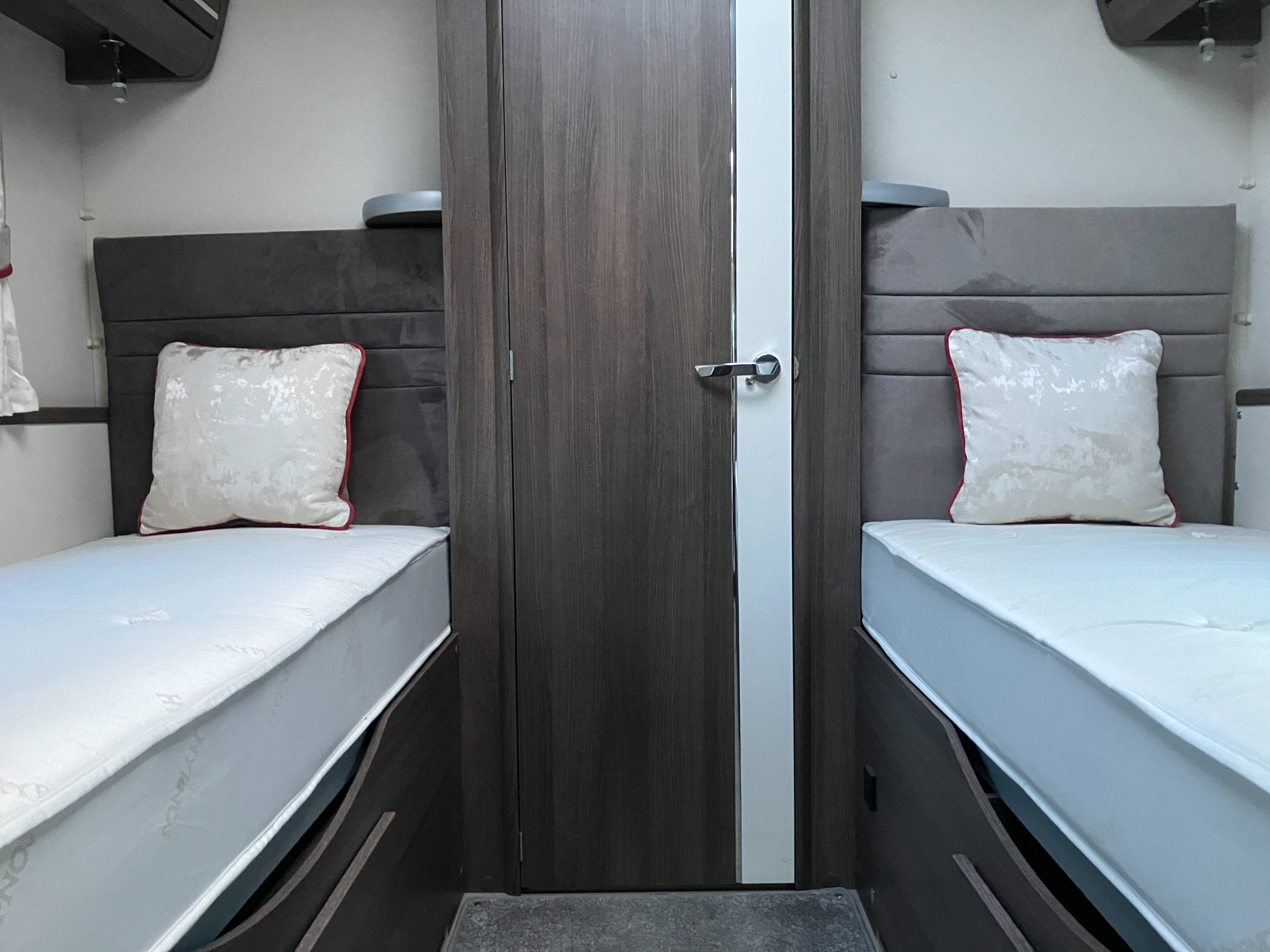 Spacious and premium coachbuild motorhome. Fitted with luxurious ALDE wet central heating, and equipped with comfortable fixed single beds, the Majestic 285 is perfect for couples or a family of 4 looking to tour all year round. Convenient foldaway travelling seats provide flexibility for taking children or grandchildren away without compromising on couples breaks away, leaving the front lounge as a cosy area to relax. Warm LED lighting, generous washroom, and fully equipped kitchen make the Majestic 285 the ideal winter or summer retreat.