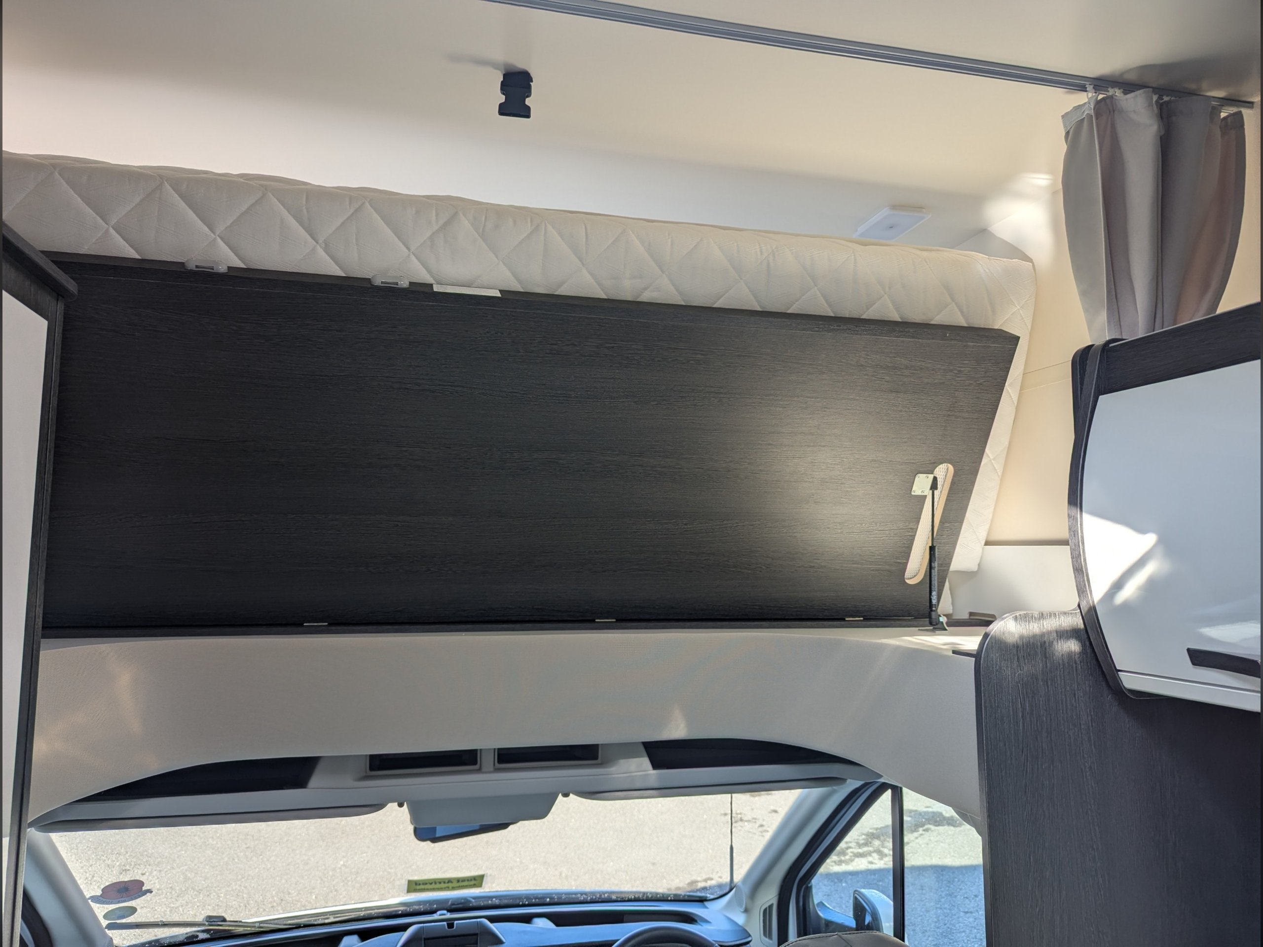 The layout features a fixed overcab double bed offering a private sleeping space.