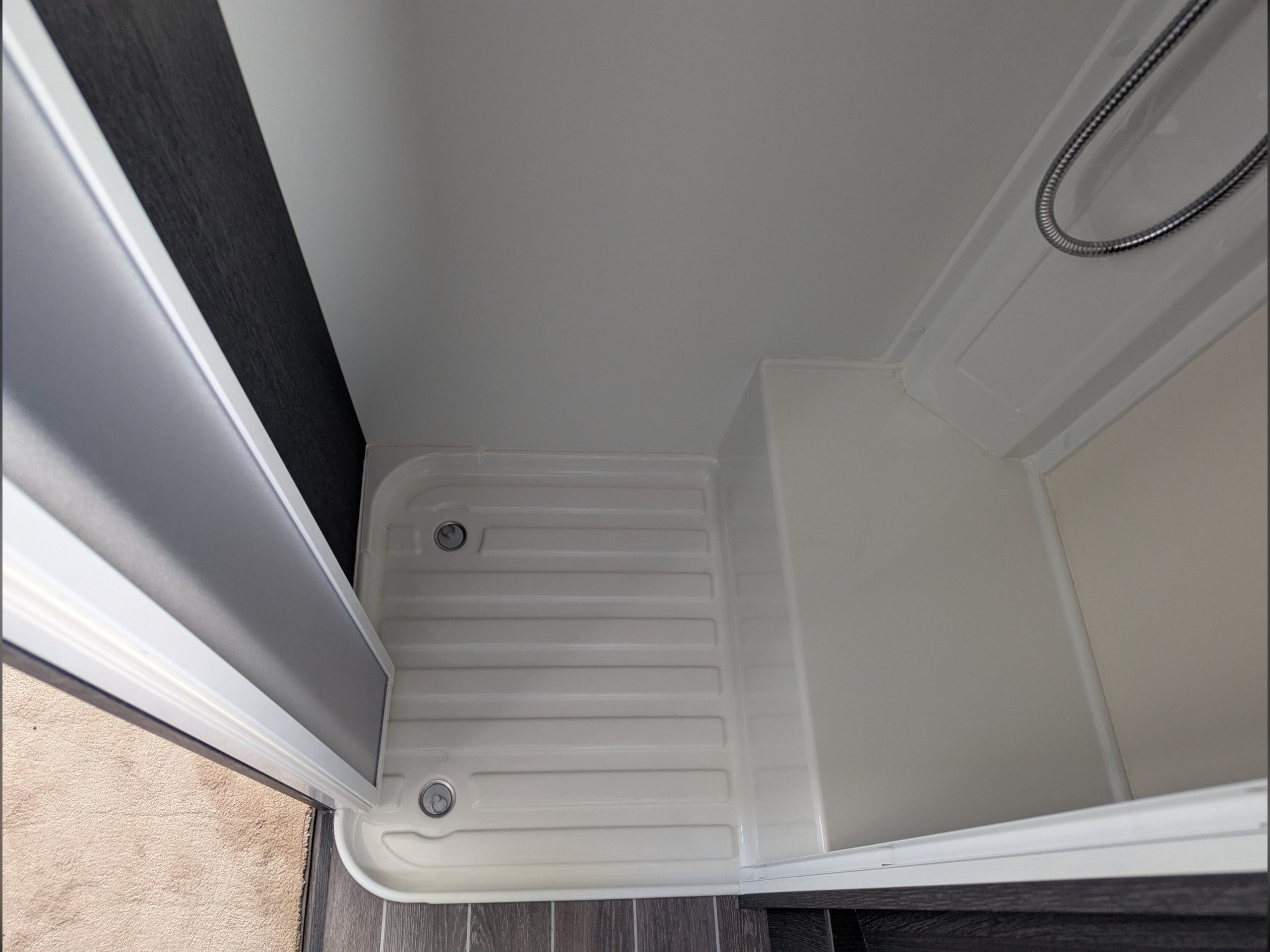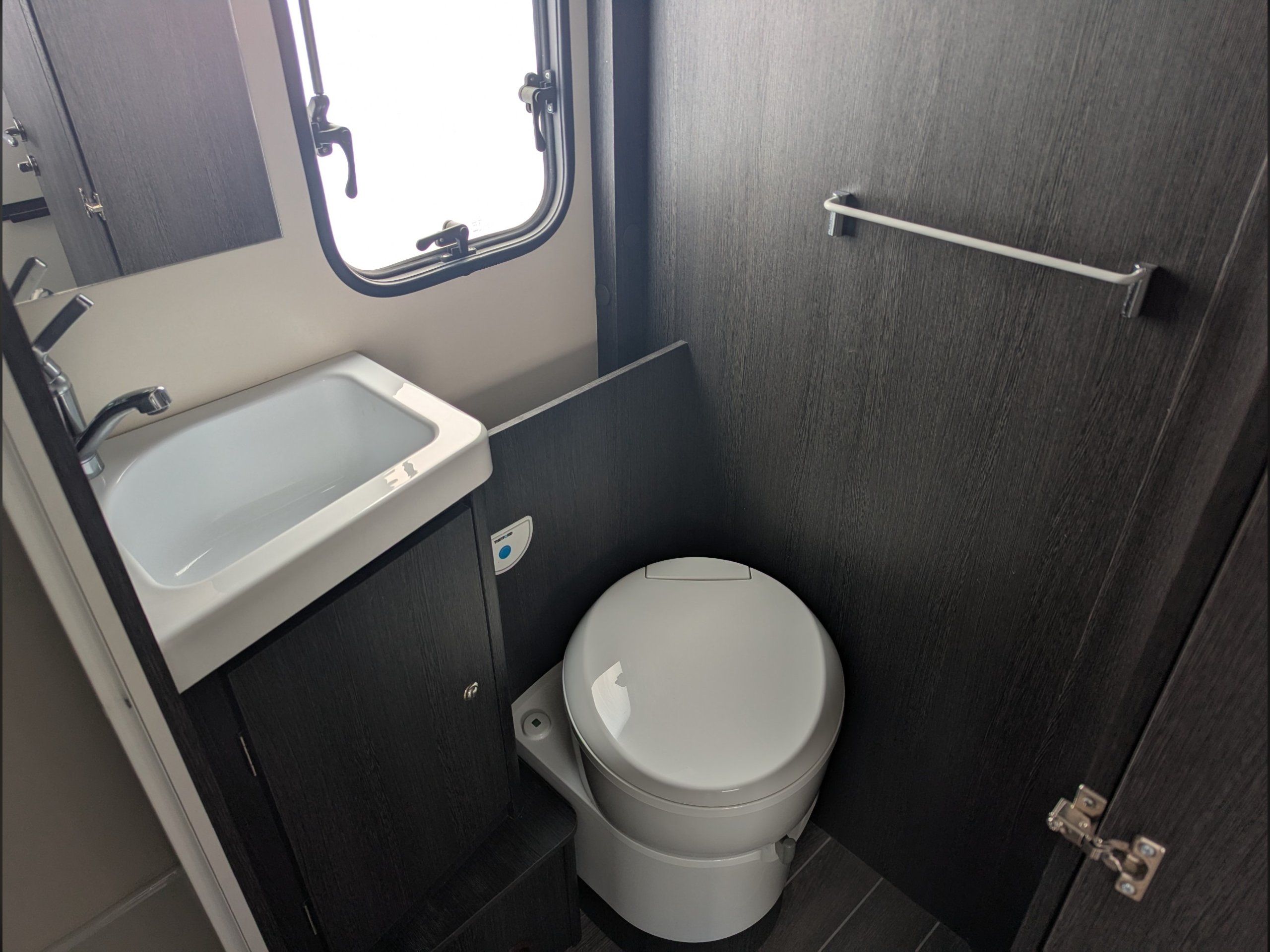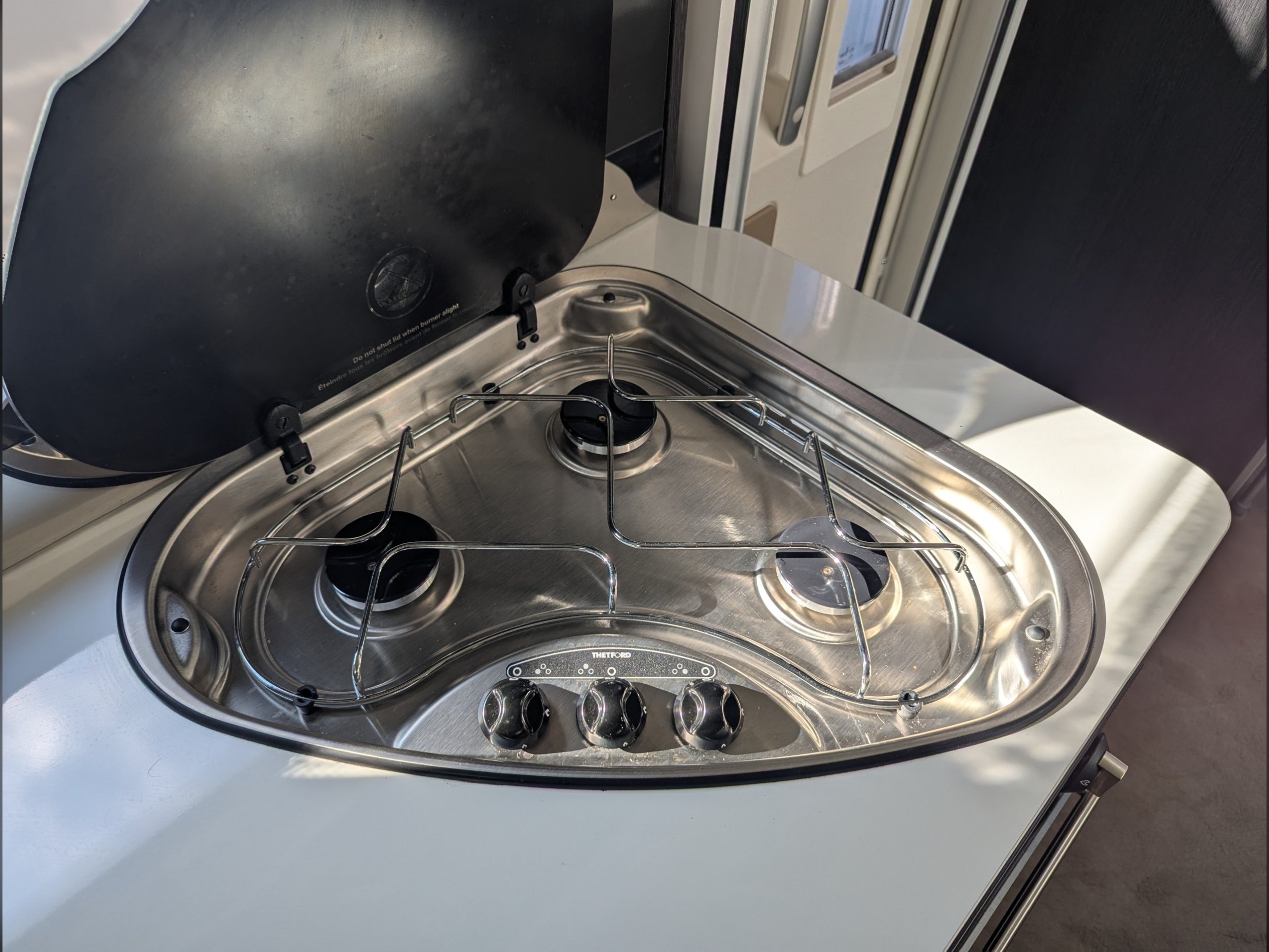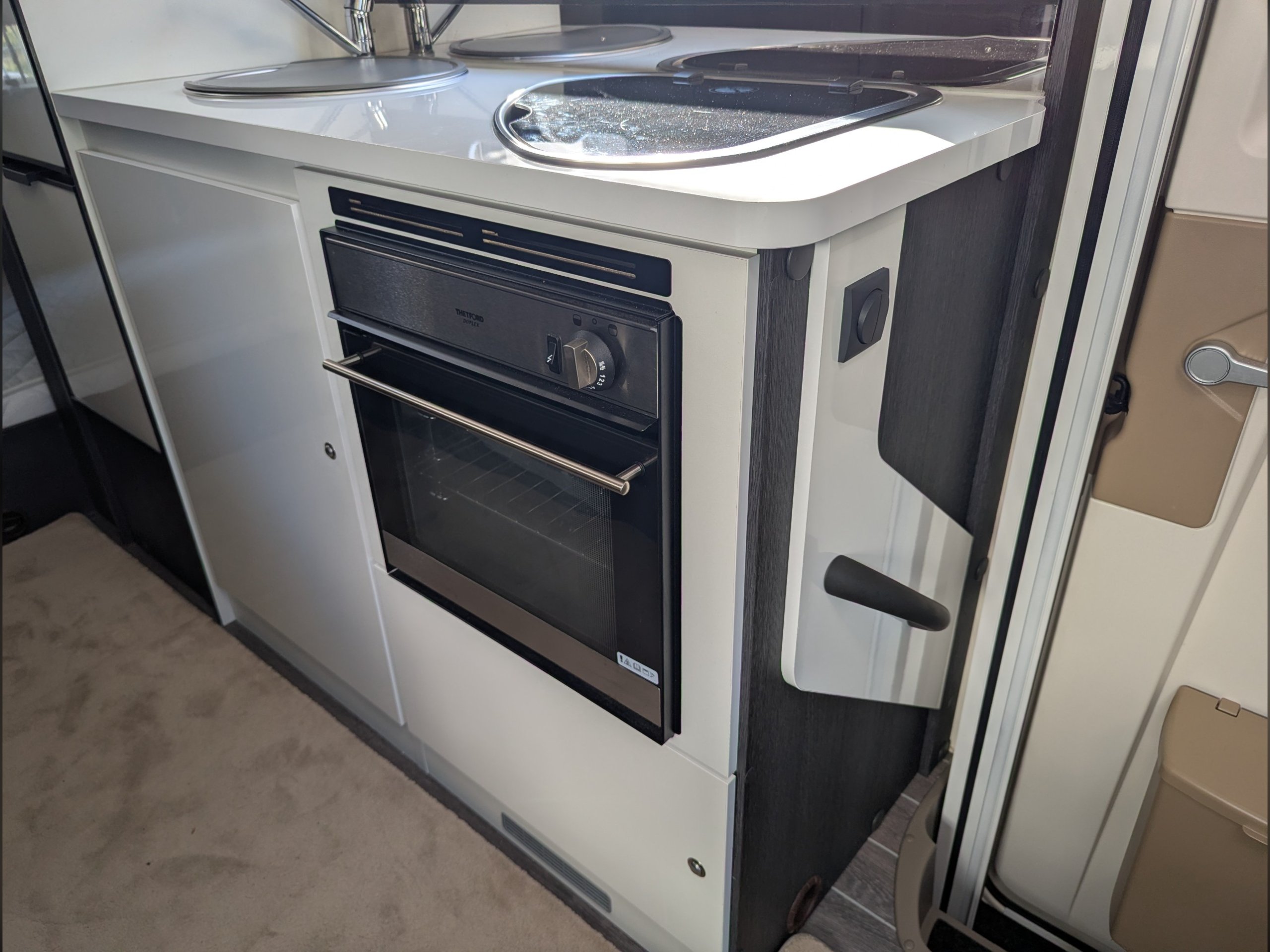The kitchen includes a 3-burner hob, oven/grill, and fridge/freezer, while the bathroom has a separate shower cubicle, cassette toilet, and sink.