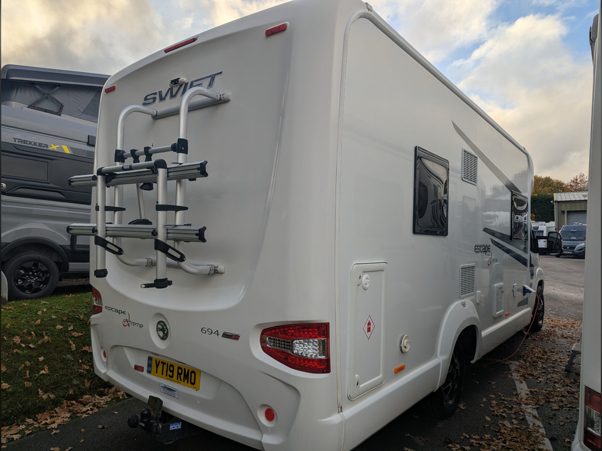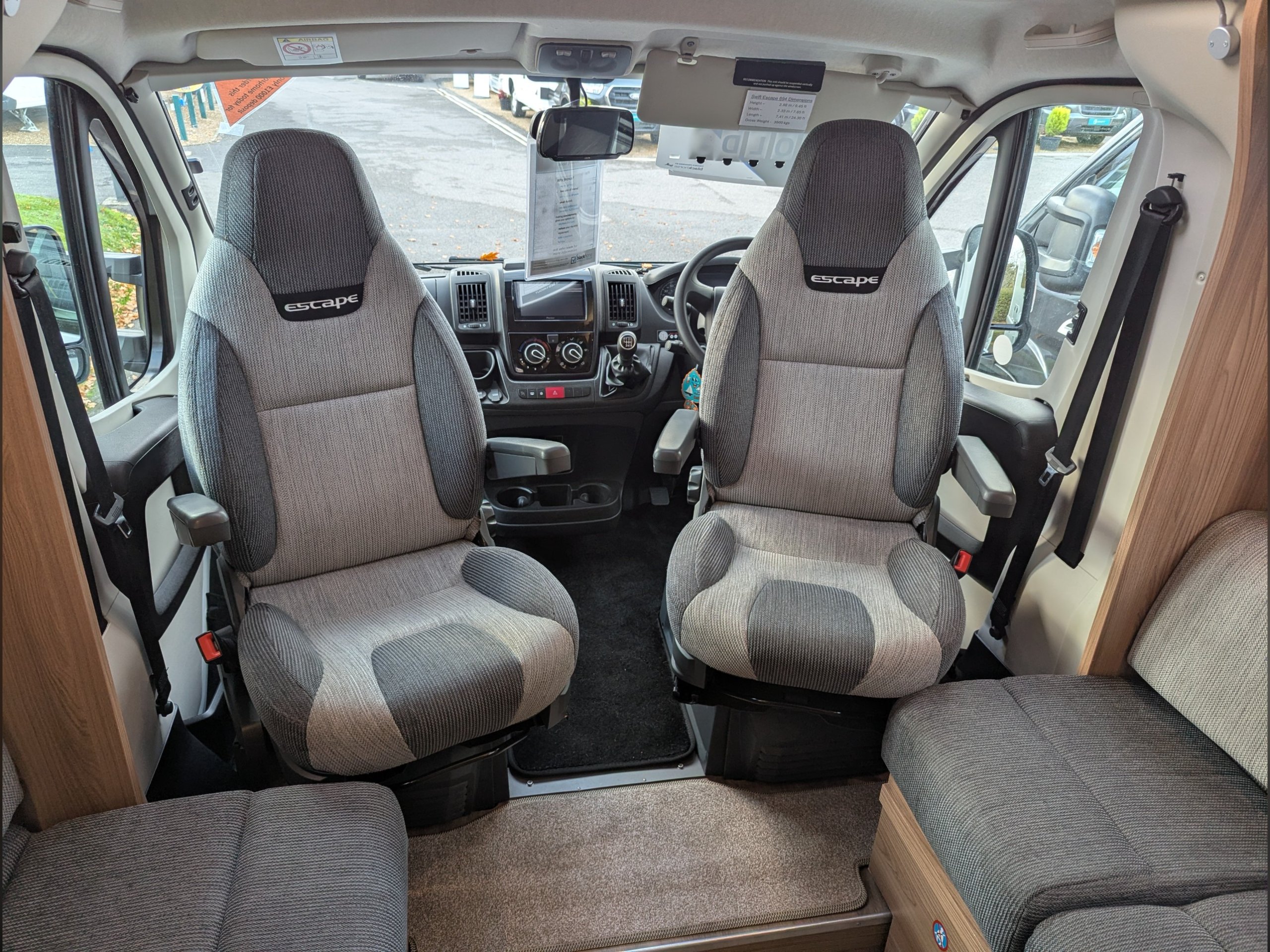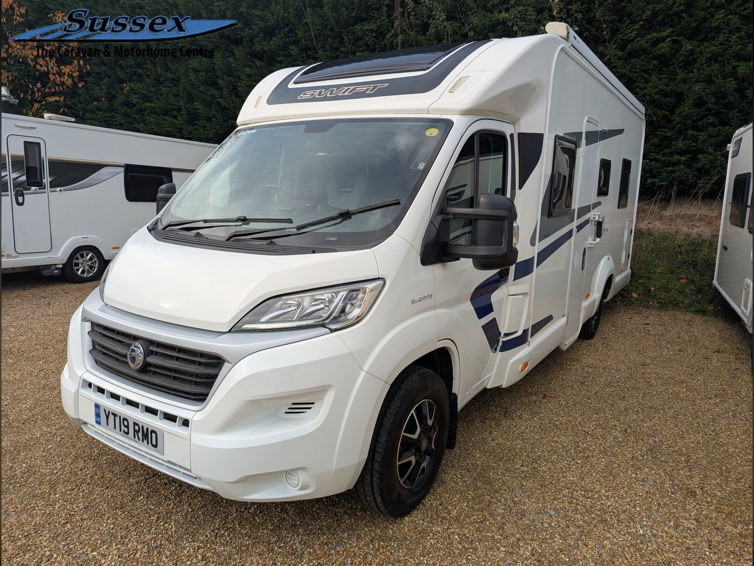 The 2019 Swift Escape 694 features a rear island bed, a central kitchen and washroom, and a front lounge with two bench seats and two swivel cab seats.