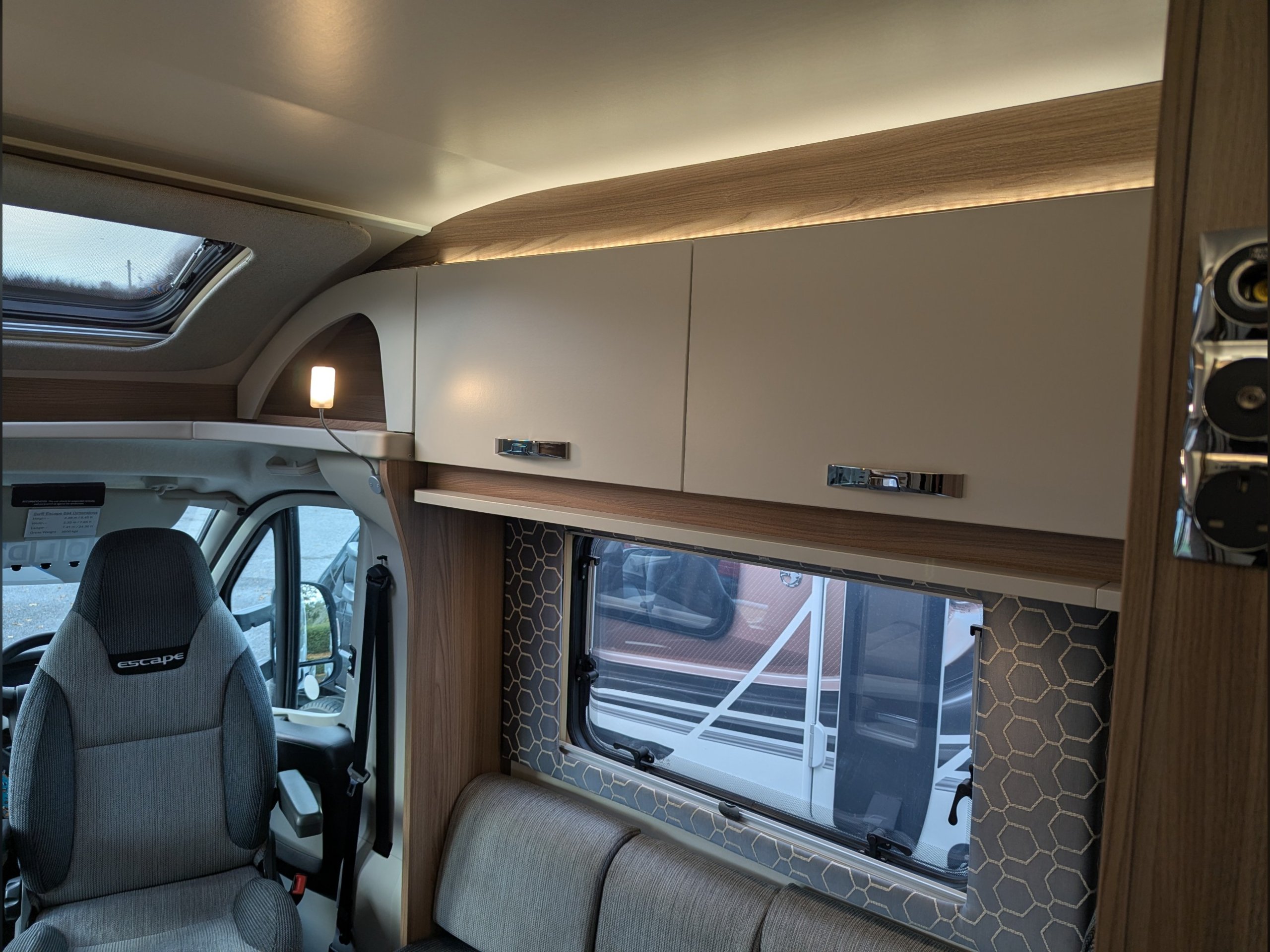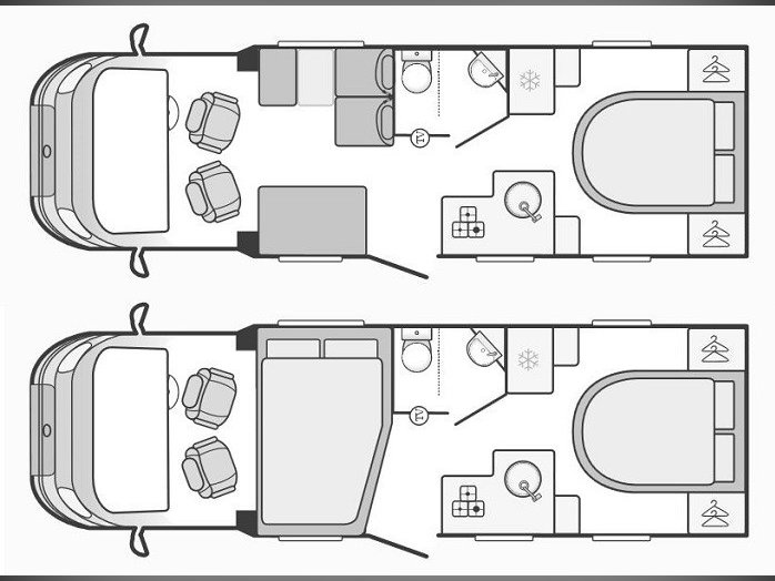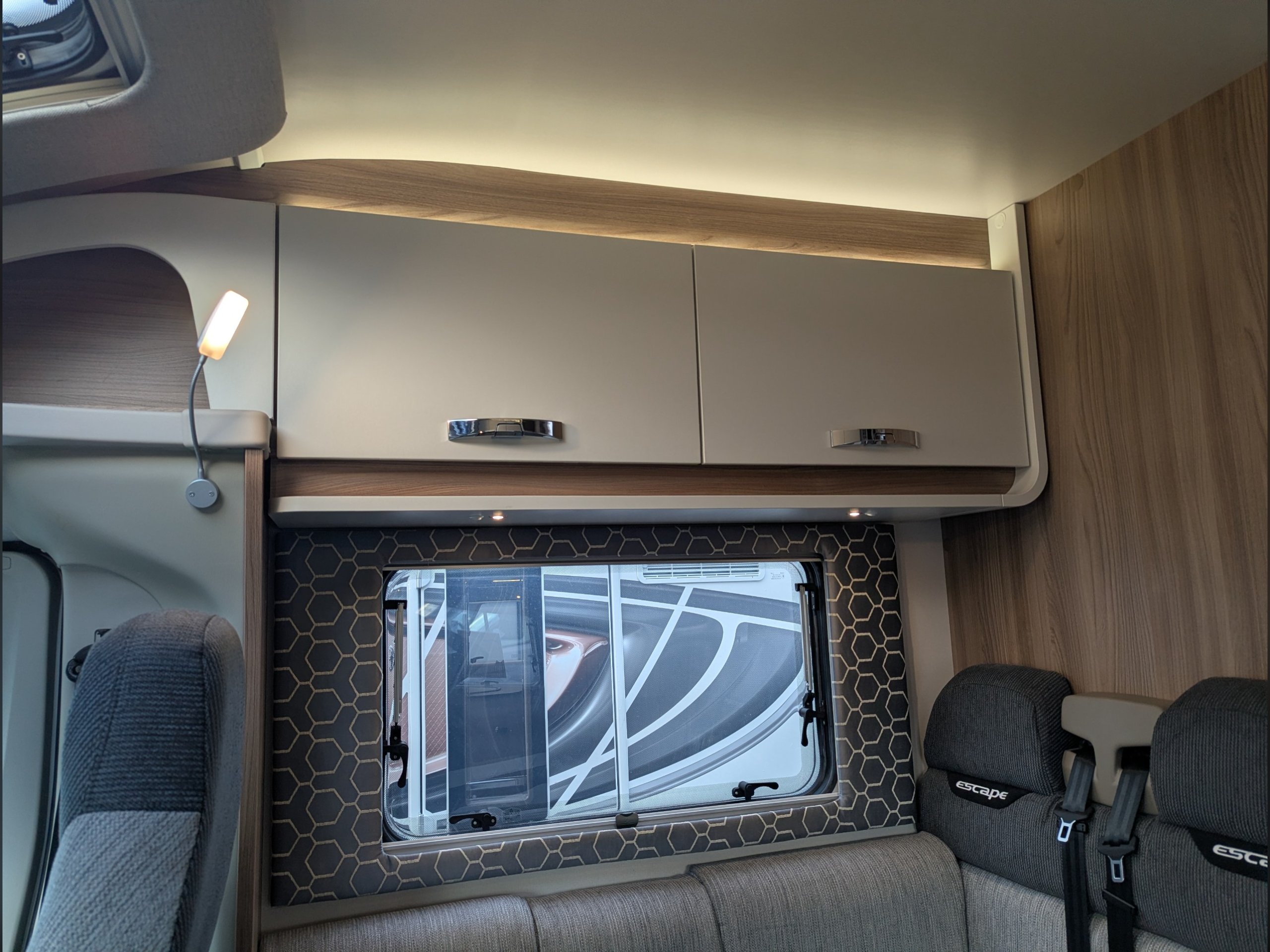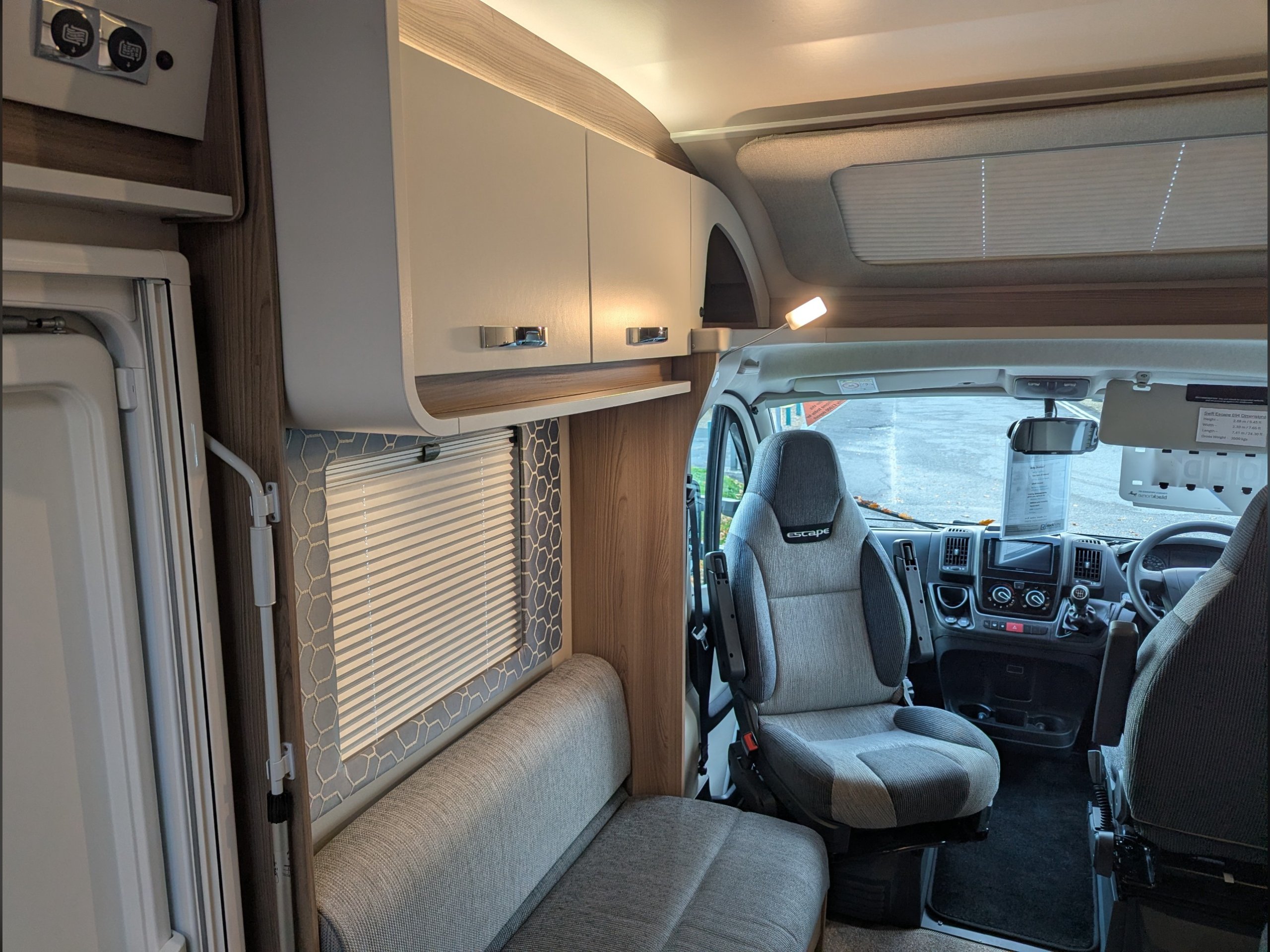 The 2019 Swift Escape 694 features a rear island bed, a central kitchen and washroom, and a front lounge with two bench seats and two swivel cab seats.